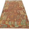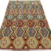 A tribal Kilim rug handwoven with fine wool on a wool foundation. This oriental rug features a geometric pattern in multiple colors. It is new and in excellent condition.