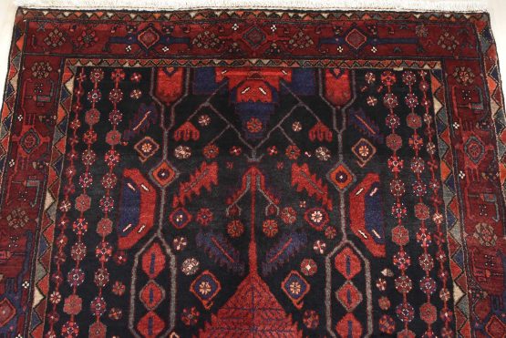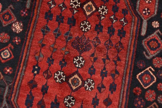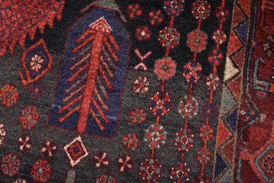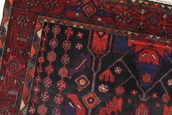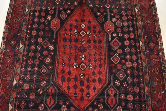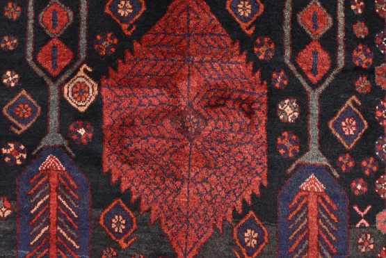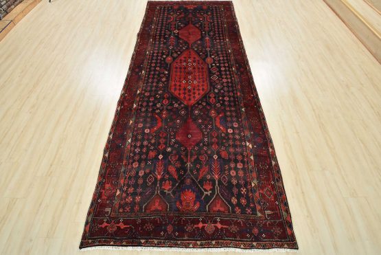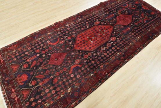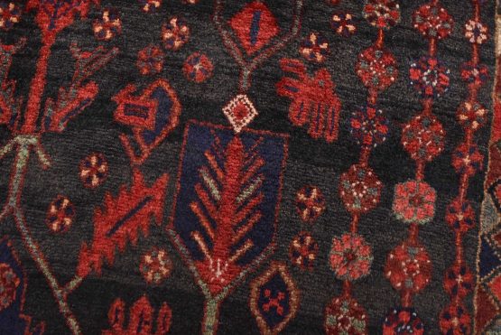 An authentic semi-antique tribal Kolyai runner hand-knotted with fine wool and natural dyes. This nomadic oriental rug features a central geometric medallion surrounded by geometric flowers with botanical designs set against a black background. It has a full wool pile with no worn areas and is in very good condition.