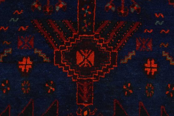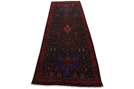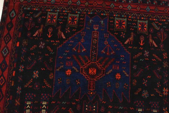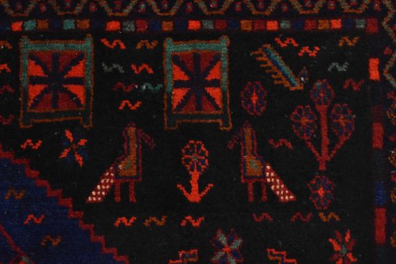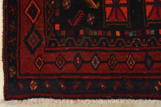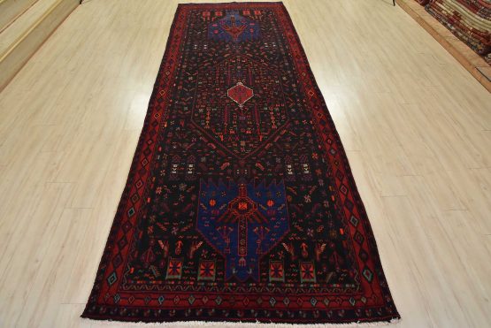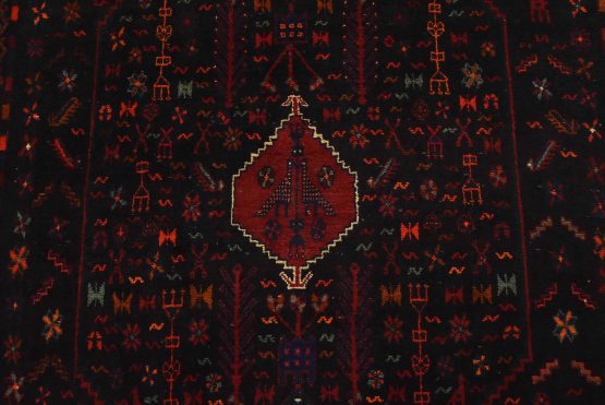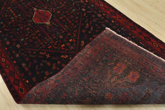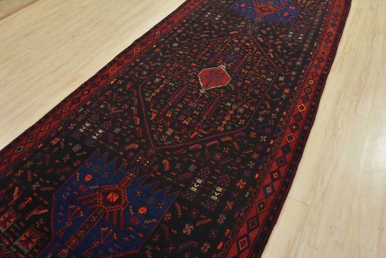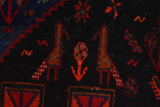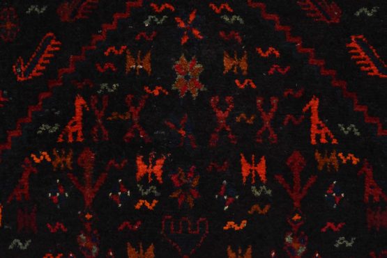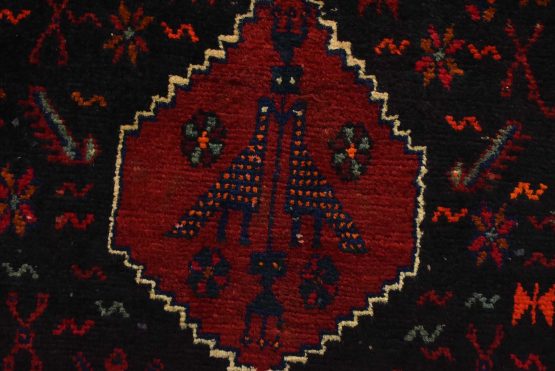An authentic vintage tribal Kolyai runner hand-knotted with fine wool and natural dyes. This nomadic rug features a central medallion with two large geometric shapes at each end, surrounded by geometric bird and animal figures set against a black background. It has a full wool pile with no worn areas and is in very good condition.