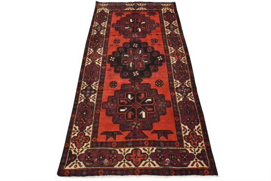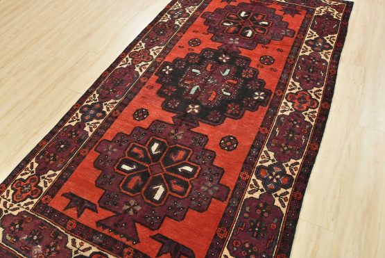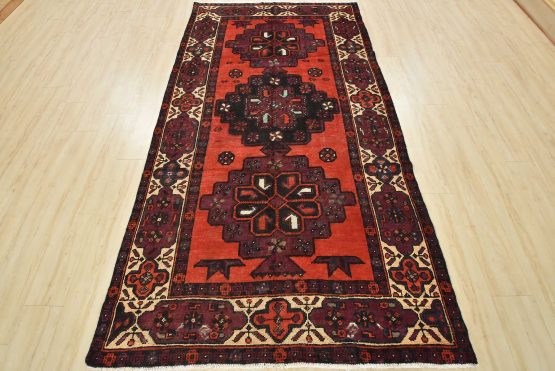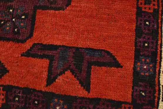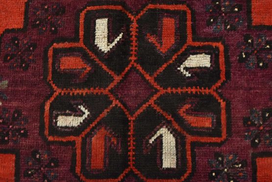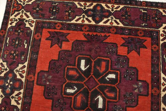 An authentic semi-antique tribal Luri rug hand-knotted with fine wool and natural dyes. This rug features geometric medallions surrounded by geometric motifs set against a red background. The wool pile shows some minor wear; please refer to the photos. Otherwise, the rug is in very good condition.