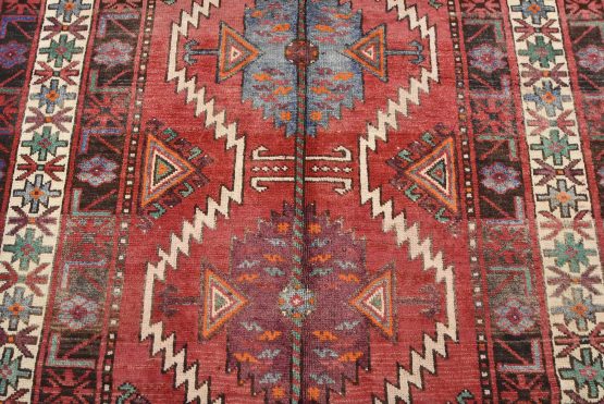 An authentic semi-antique tribal Luri rug hand-knotted with fine wool and natural dyes. This nomadic oriental rug features a row of geometric medallions surrounded by geometric motifs set against a red background. The wool pile does show some minor wear; please refer to the photos. Otherwise, this rug is in very good condition.