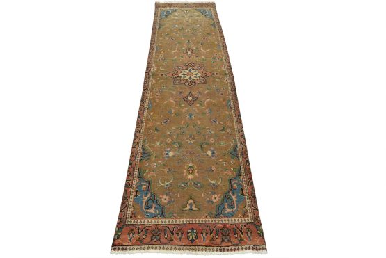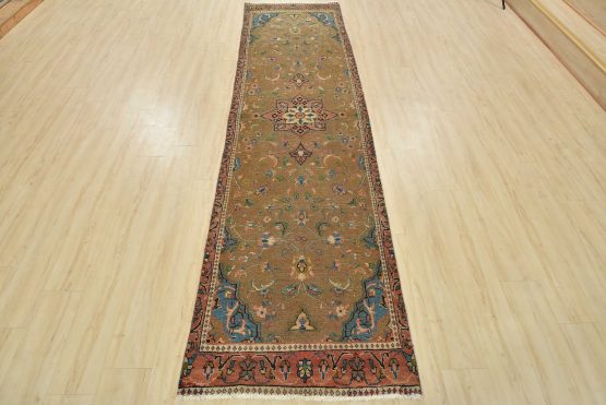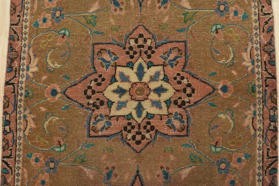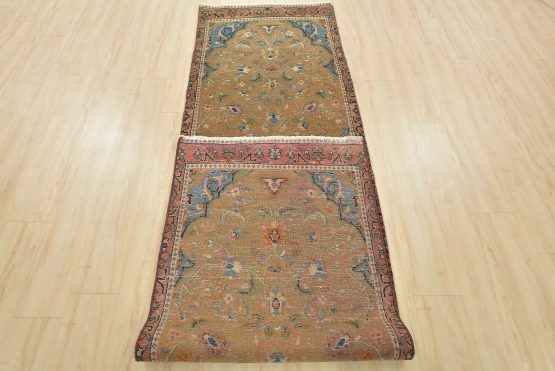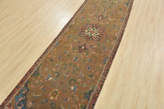 An authentic semi-antique traditional Mahal runner hand-knotted with fine wool and natural dyes. This oriental rug features a central medallion surrounded by a floral design set against a brown background. It has a low wool pile, is worn and distressed, and has minor imperfections (see photos). However, it is in very good condition.