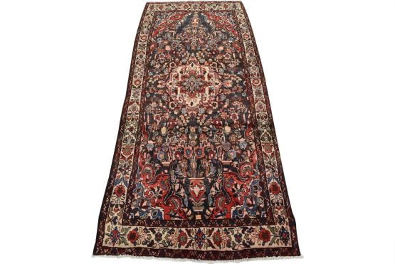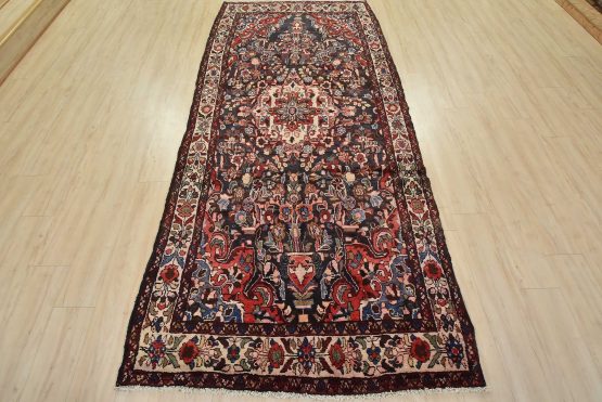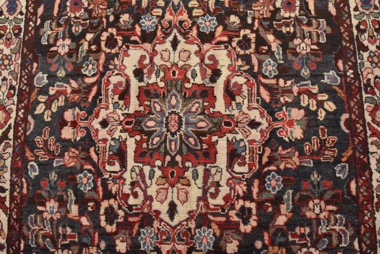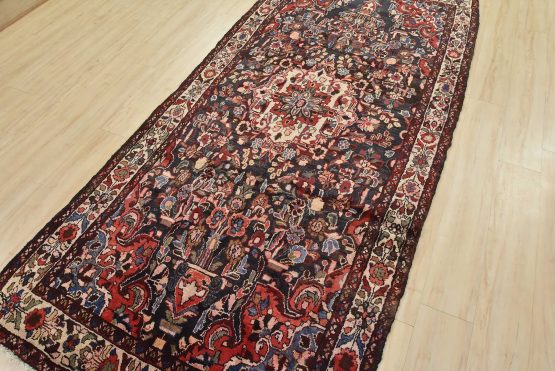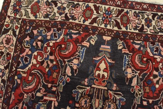 An authentic semi-antique Malayer traditional runner hand-knotted with fine wool and natural dyes. This rug features a central medallion surrounded by floral designs set against a dark blue background. The wool pile shows some minimal wear; please refer to the photos. Otherwise, this rug is in very good condition.