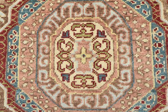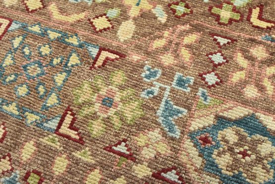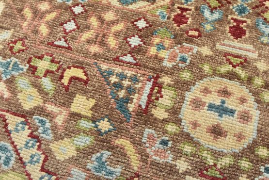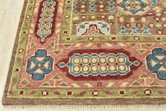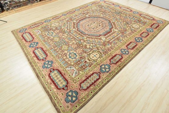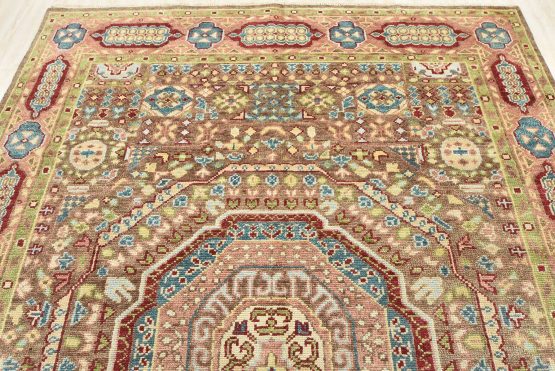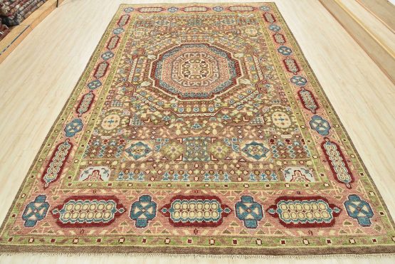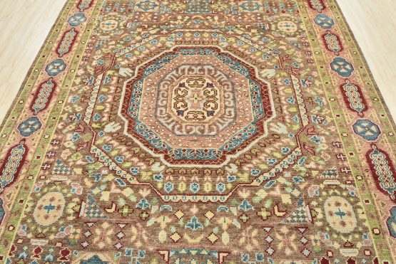 A traditional Mamluk rug hand-knotted with an all-wool pile on a cotton foundation. This oriental rug features a central medallion surrounded by a geometric botanical design set against a brown background. It is new and in excellent condition.