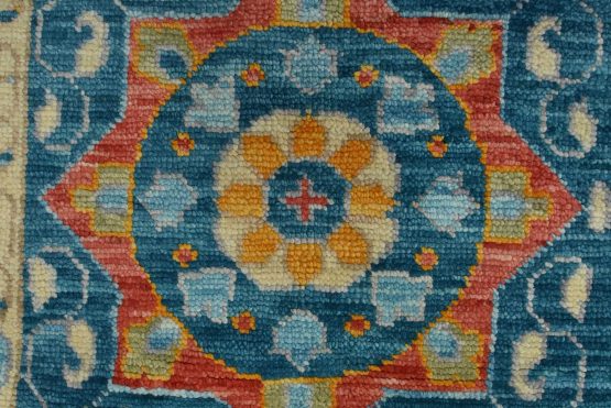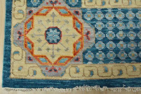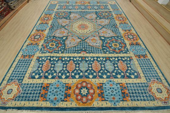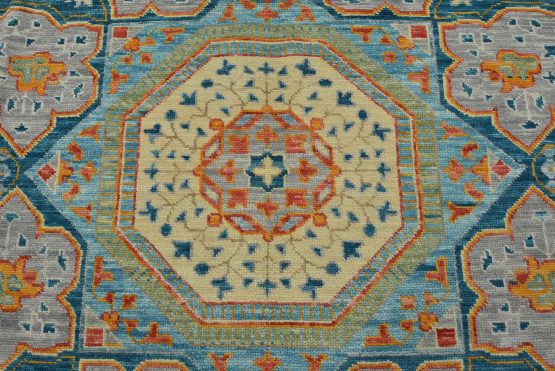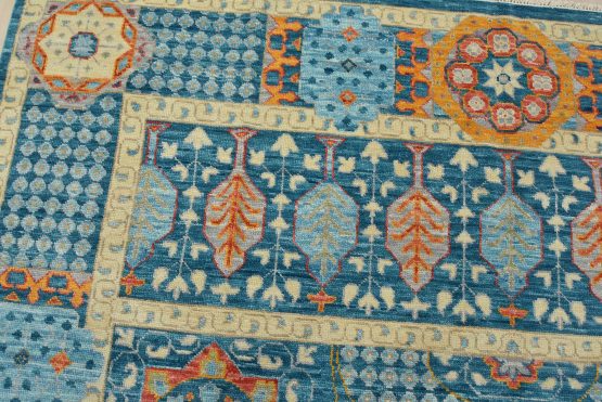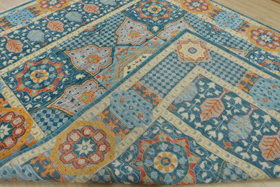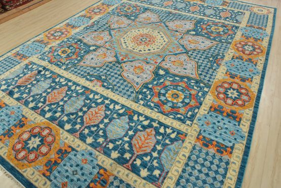 A traditional Mamluk rug hand-knotted with an all-wool pile on a cotton foundation. This oriental rug features a central geometric medallion surrounded by botanical motifs set against a blue background. It is new and in excellent condition.