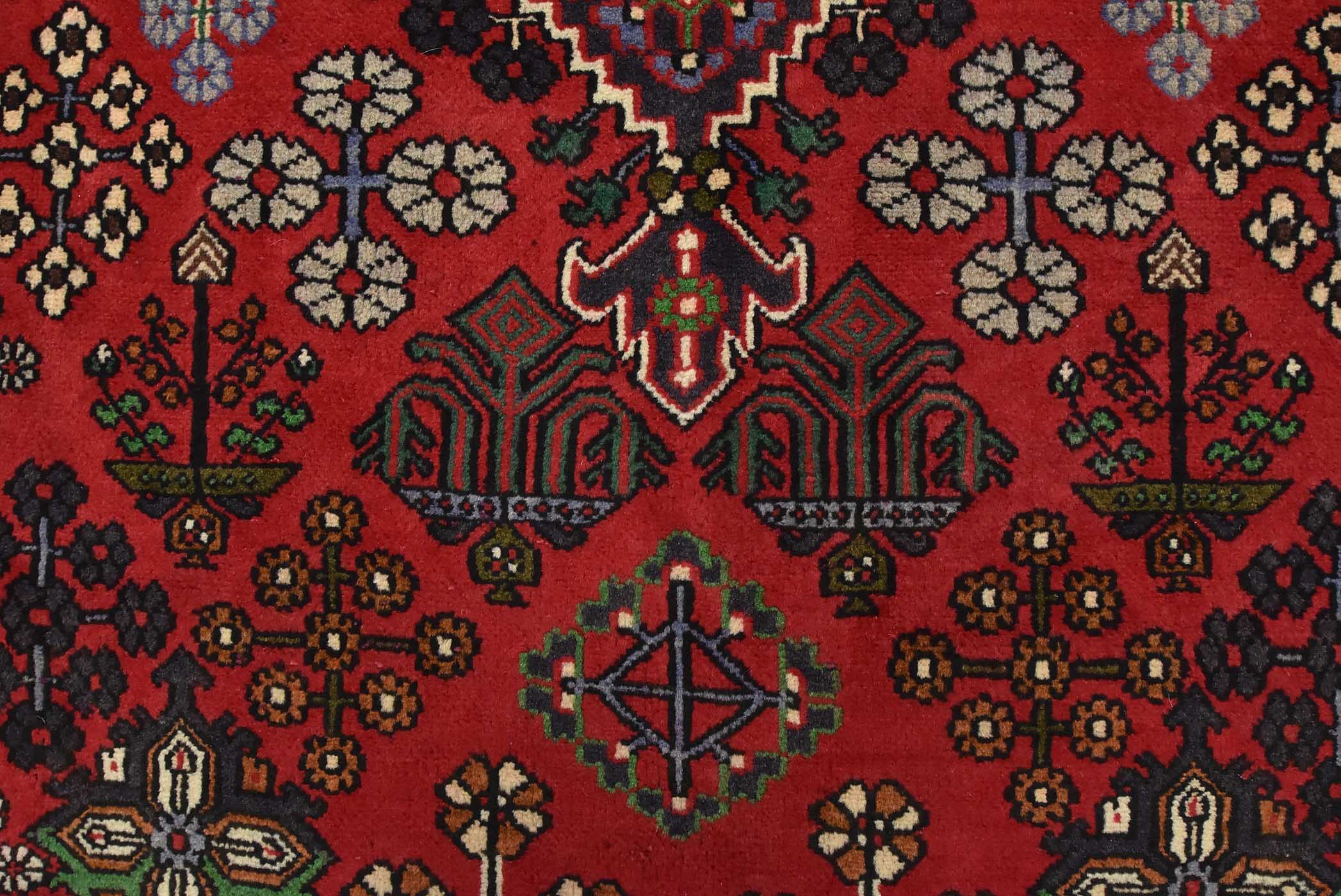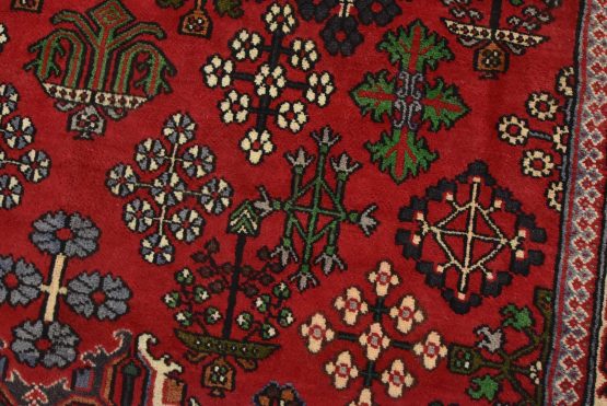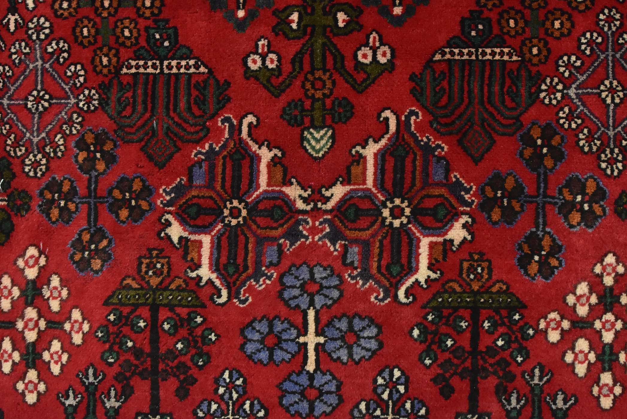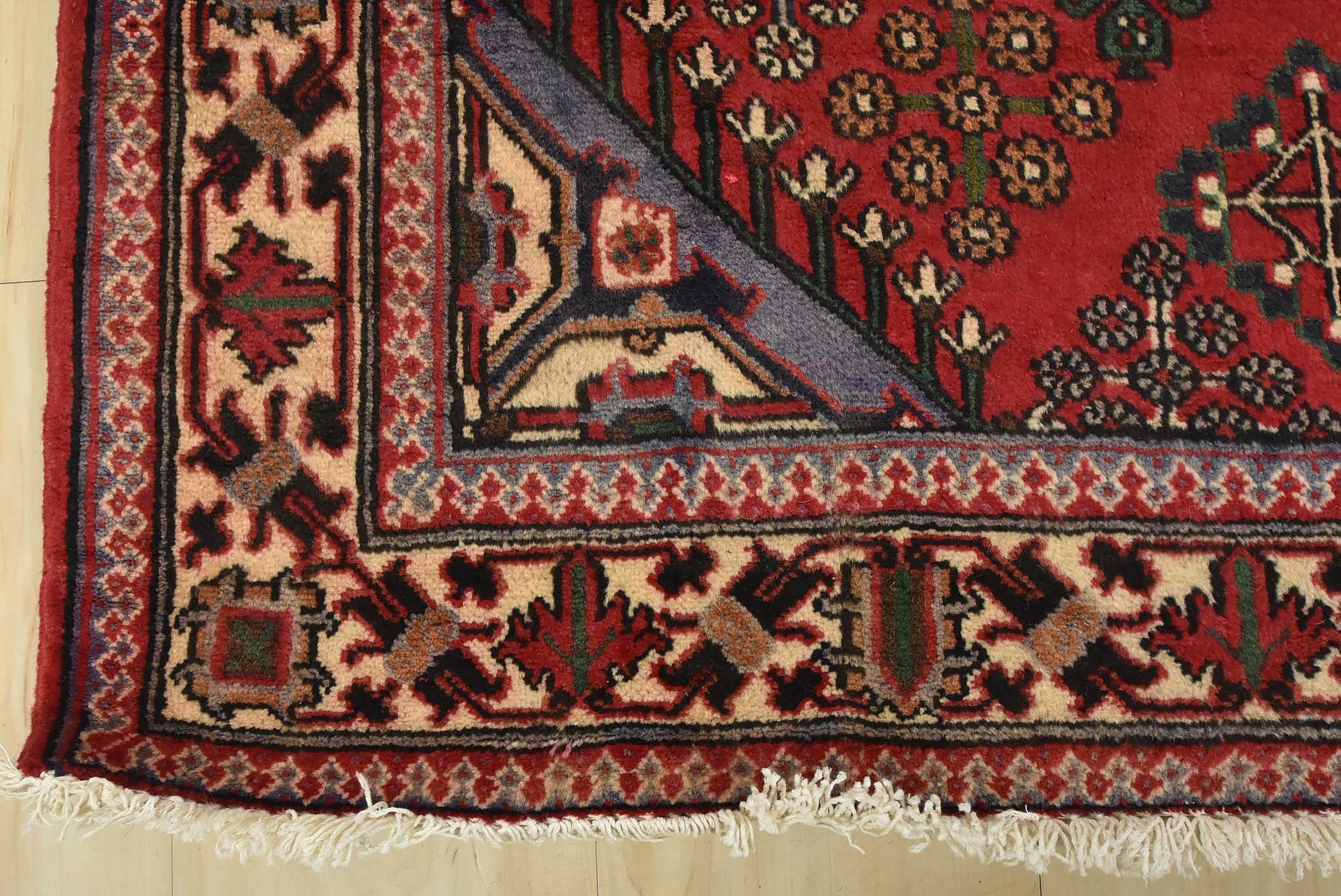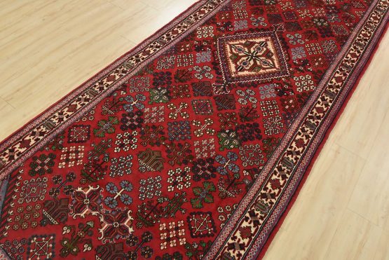 An authentic vintage tribal Maymeh runner hand-knotted with fine wool and natural dyes. This intricately woven rug features a central geometric medallion surrounded by botanical motifs set against a red background. It has a full wool pile with no worn areas and is in very good condition.