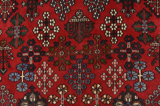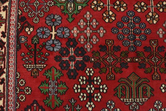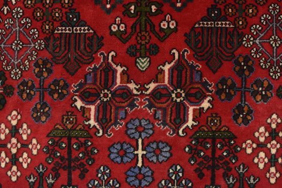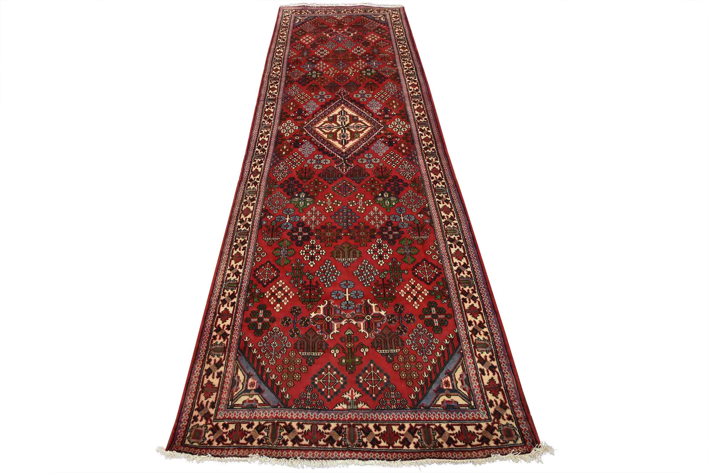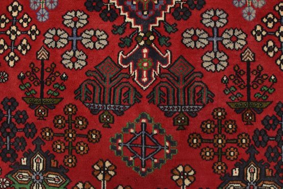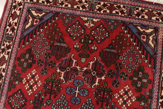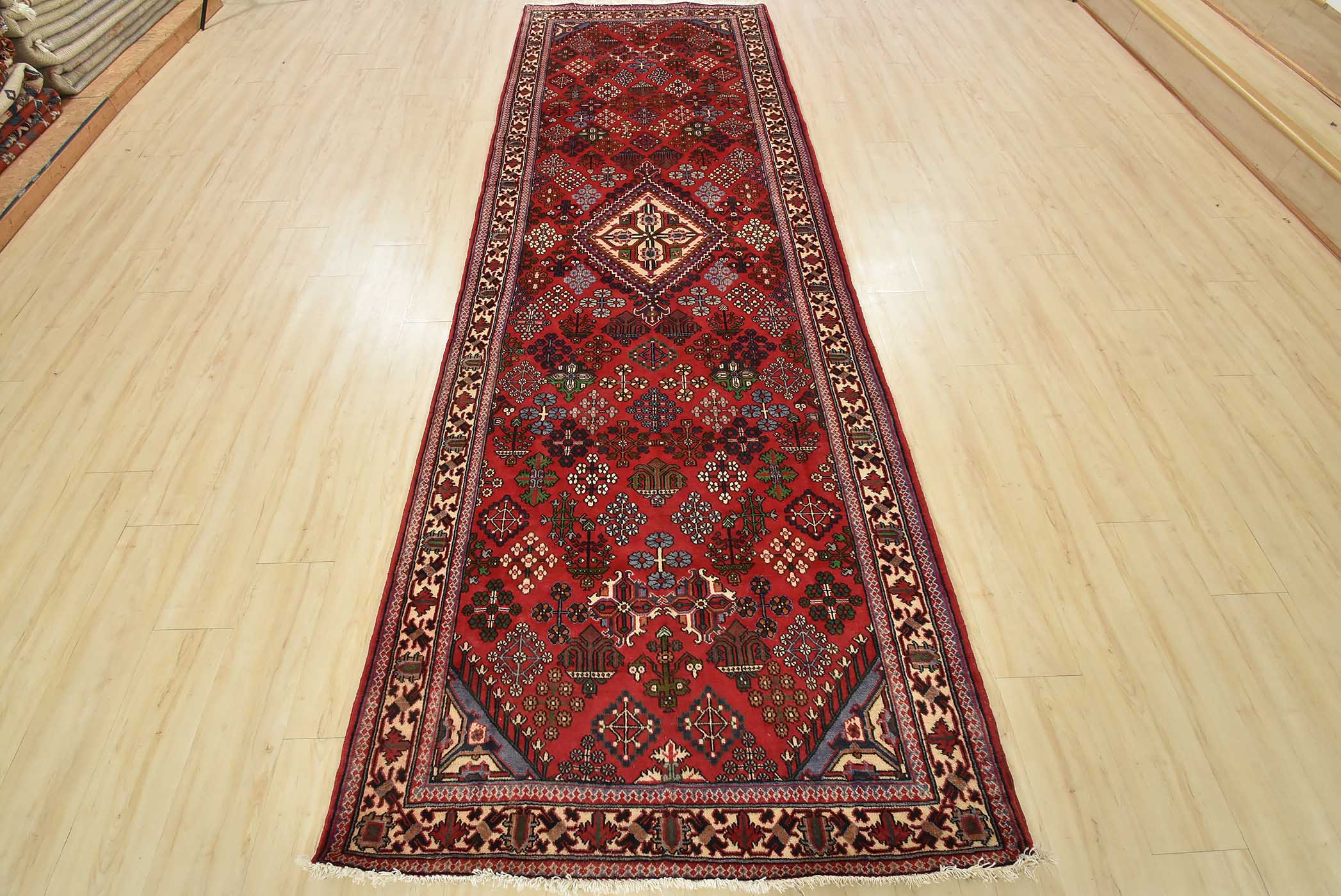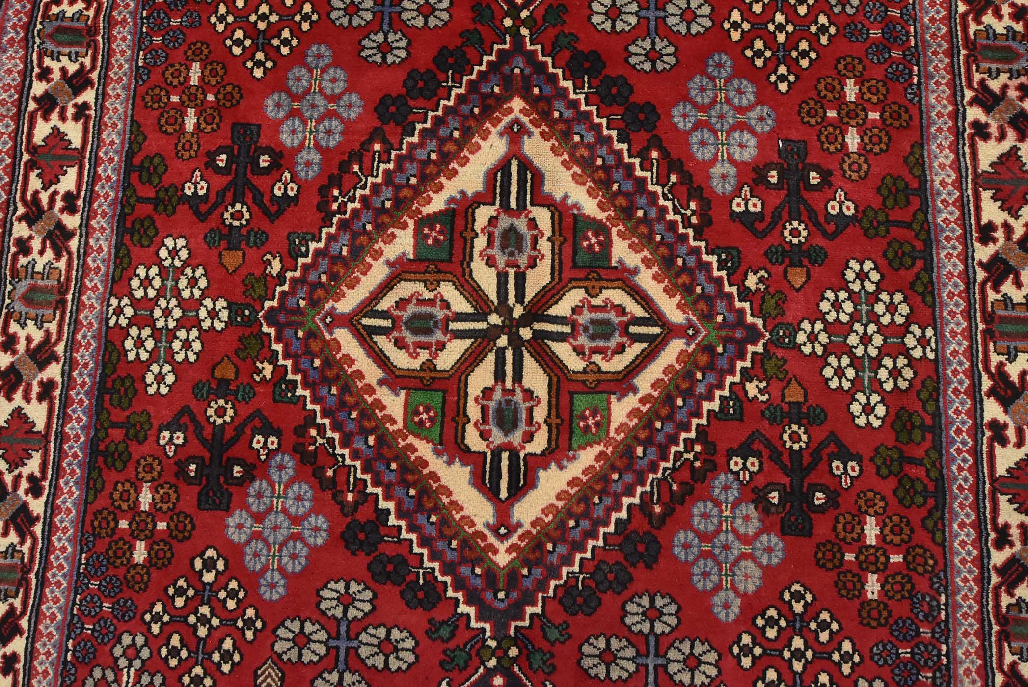 An authentic vintage tribal Maymeh runner hand-knotted with fine wool and natural dyes. This intricately woven rug features a central geometric medallion surrounded by botanical motifs set against a red background. It has a full wool pile with no worn areas and is in very good condition.