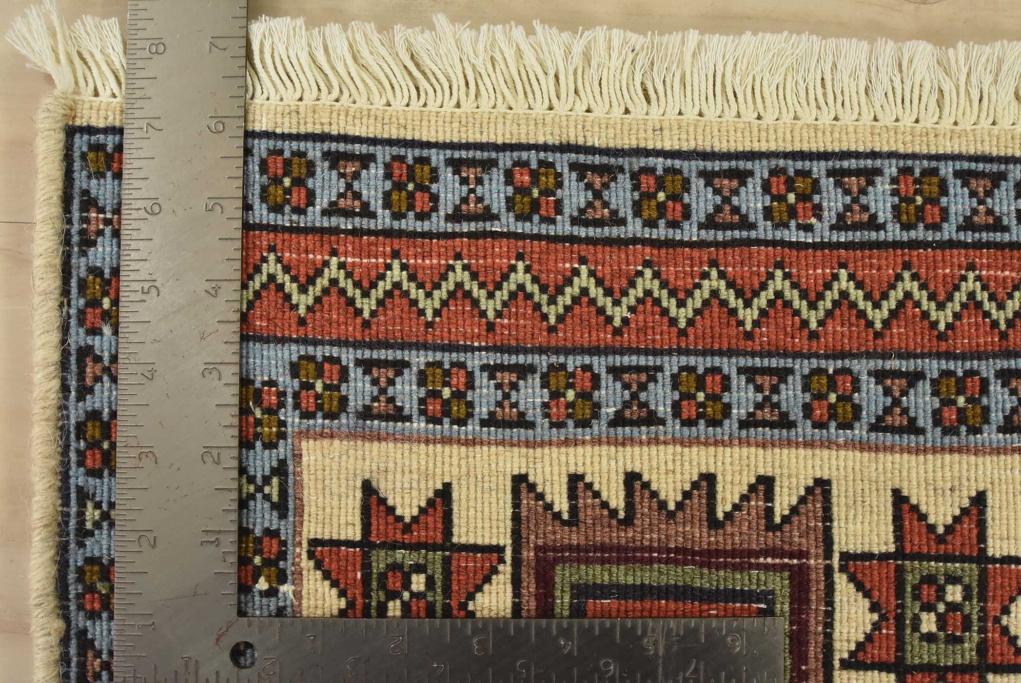 An authentic vintage tribal Meshkin rug hand-knotted with fine wool and natural dyes. This rug features geometric motifs set against an ivory background. It has a full wool pile with no worn areas and is in very good condition.