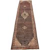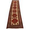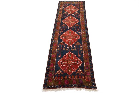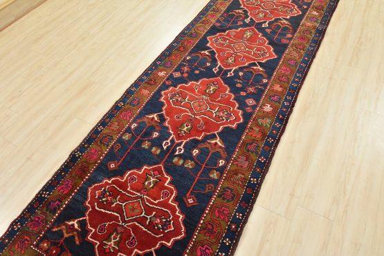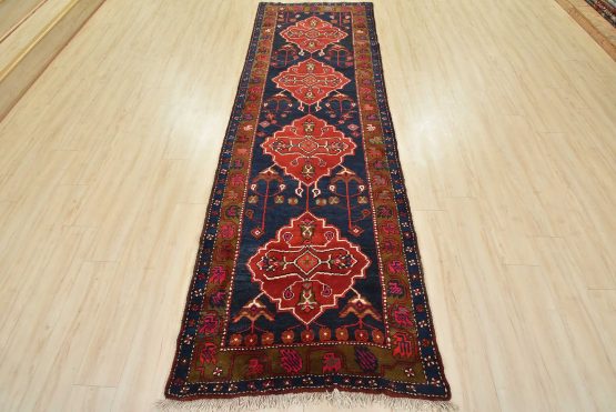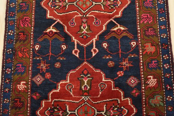 An authentic semi-antique tribal Meshkin runner hand-knotted with fine wool and natural dyes. This nomadic oriental rug features a row of medallions surrounded by botanical motifs set against a dark blue background. It has a full wool pile with no worn areas and is in very good condition.