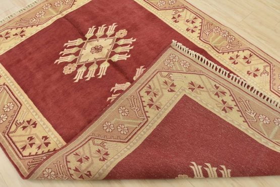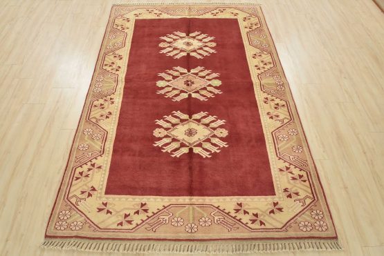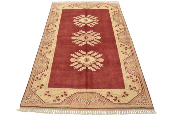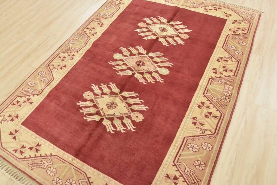 An authentic vintage traditional tribal Milas rug hand-knotted with fine wool and natural dyes. This oriental rug features three geometric medallions set against a red background. It has a full wool pile with no worn areas and is in very good condition.