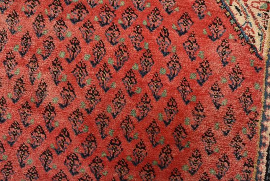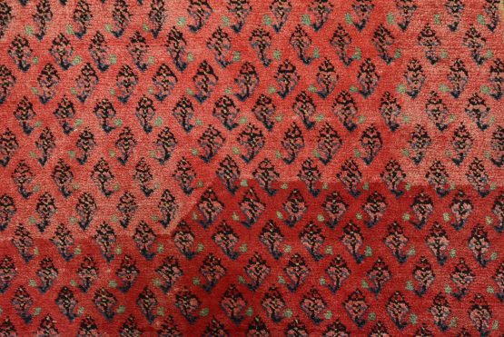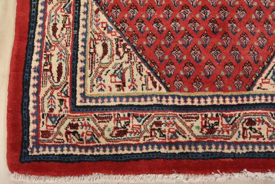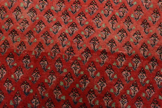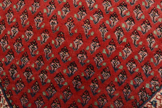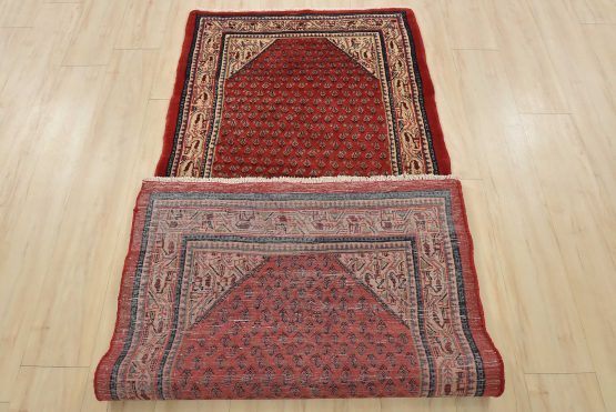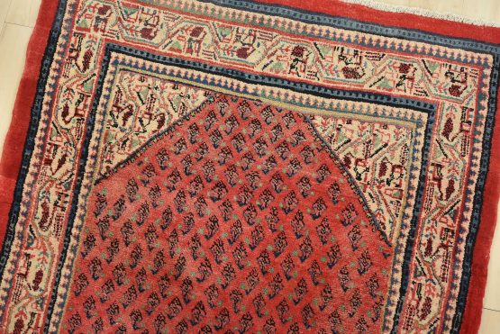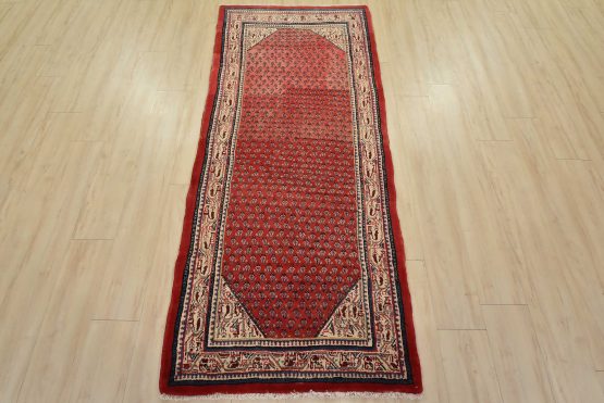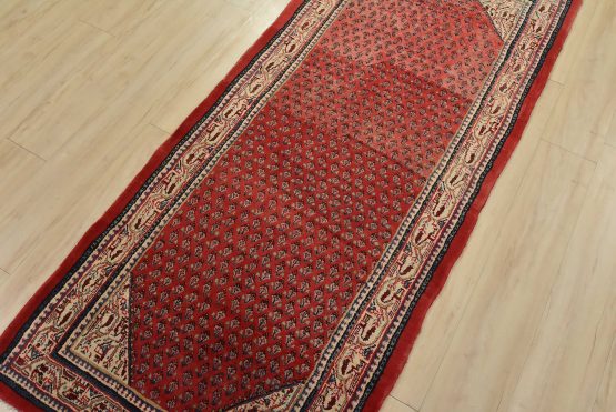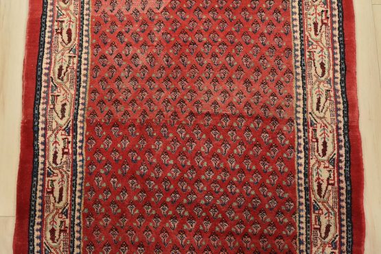 An authentic vintage tribal Mir runner hand-knotted with fine wool and natural dyes. This nomadic oriental rug features an all-over small-scale geometric Boteh pattern set against a red background. The wool pile shows some minor wear; please refer to the photos. Otherwise, the rug is in very good condition.