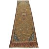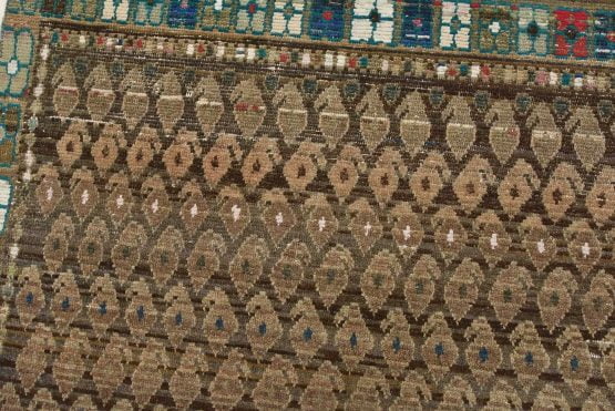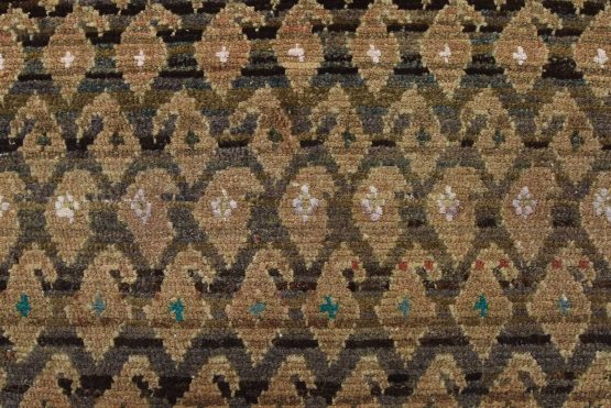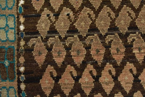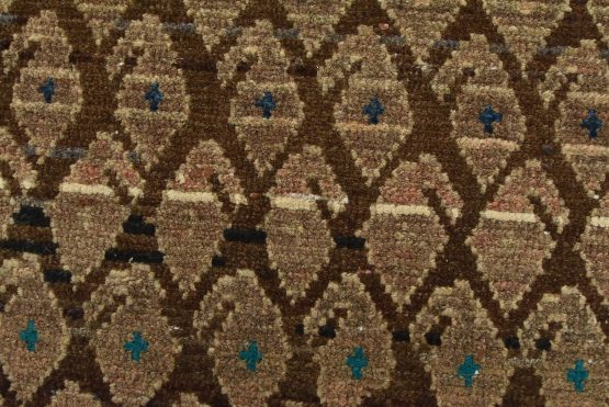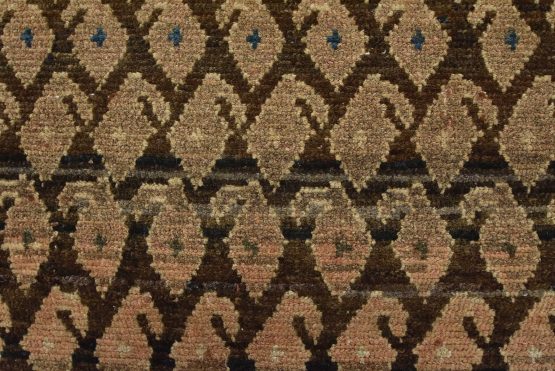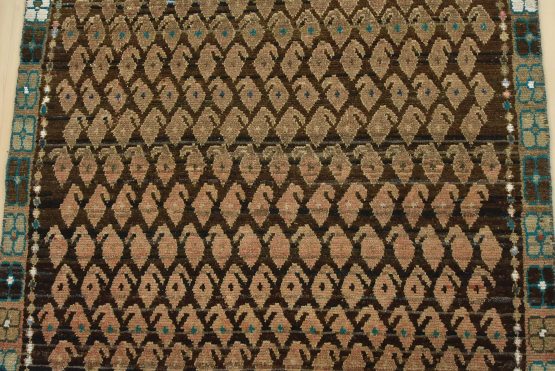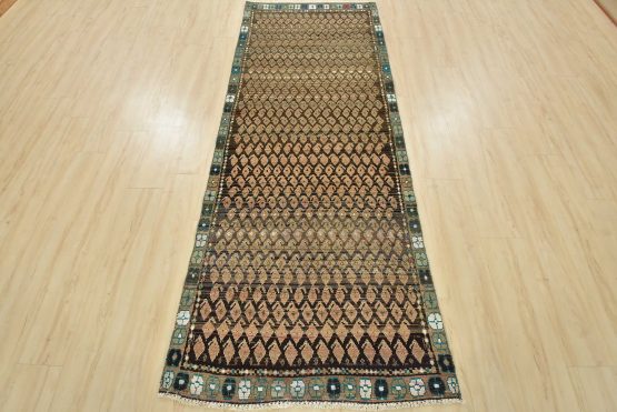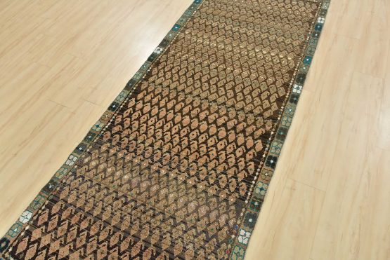 An authentic semi-antique tribal Mir runner hand-knotted with fine wool and natural dyes. This nomadic rug features an all-over geometric boteh pattern set against a brown background. It has a low wool pile, is worn and distressed, and has minor imperfections (see photos). However, it is in very good condition.