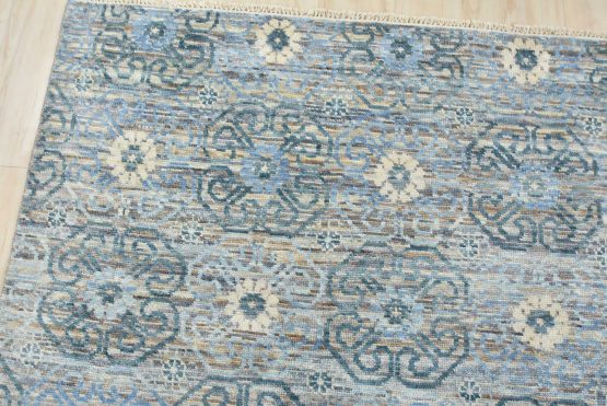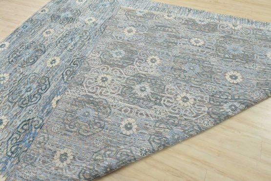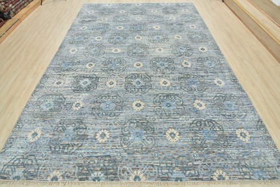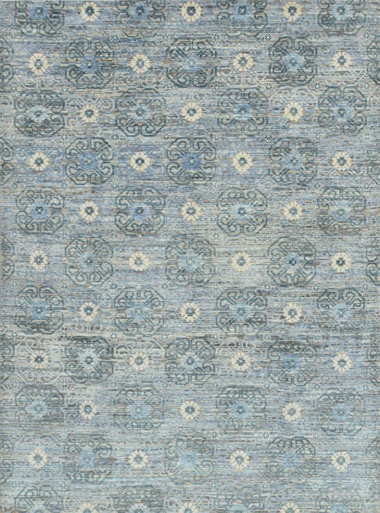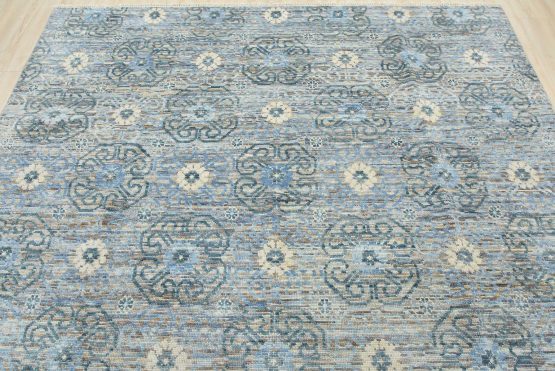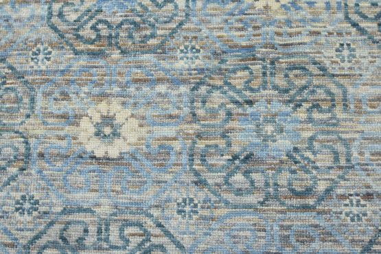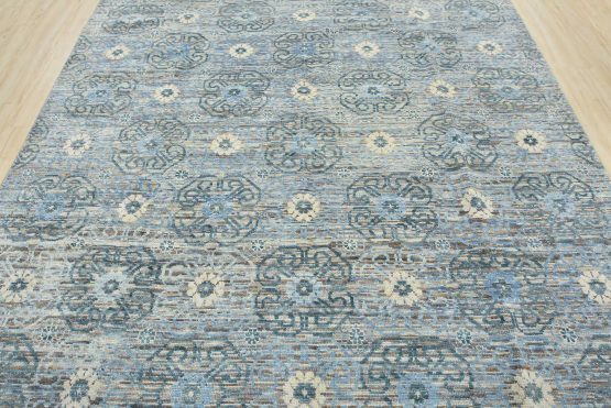 A Modern rug hand-knotted with an all-wool pile on a cotton foundation. This oriental rug features rows of botanical motifs set against a gray background. It is new and in excellent condition.