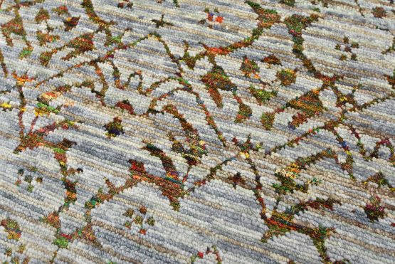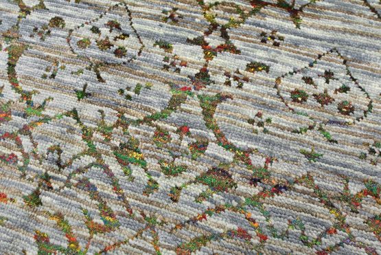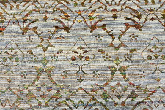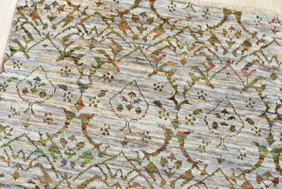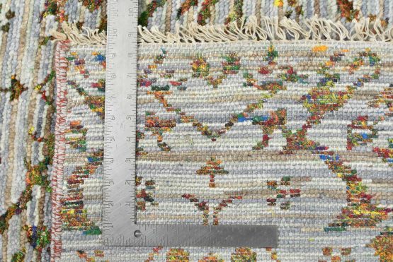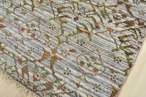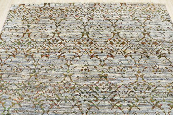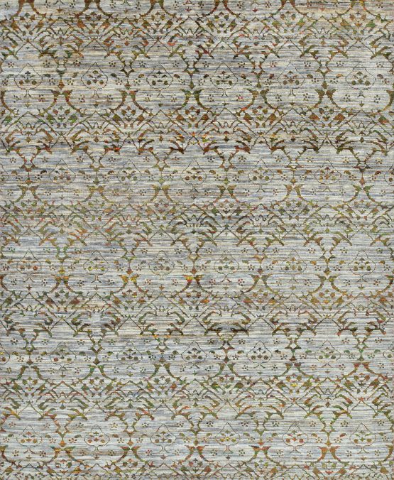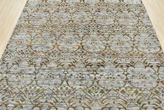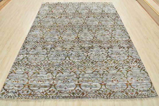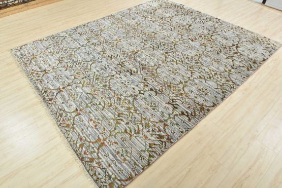 A modern Ikat rug hand-knotted with a wool pile and viscose highlights on a cotton foundation. This oriental rug features an all-over Ikat pattern composed of botanical motifs set against a gray background. It is new and in excellent condition.