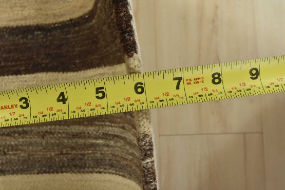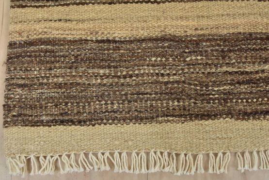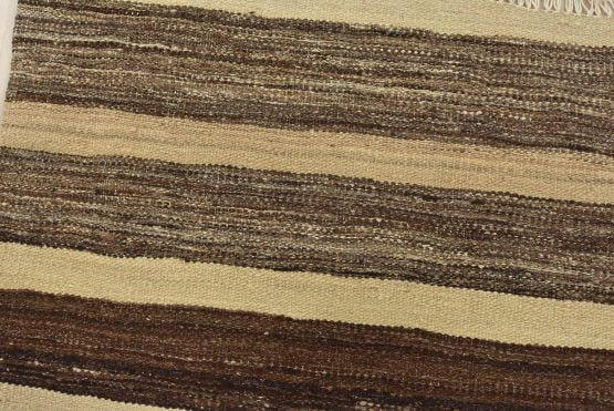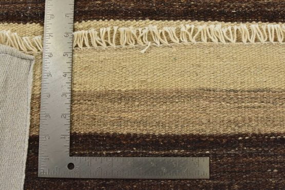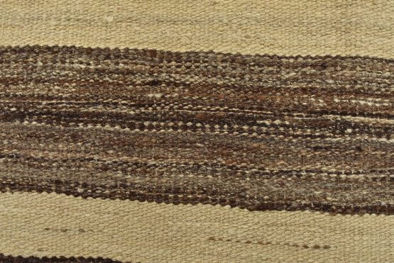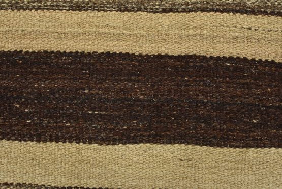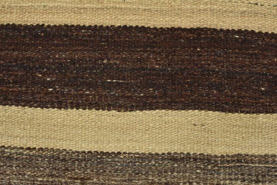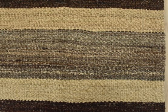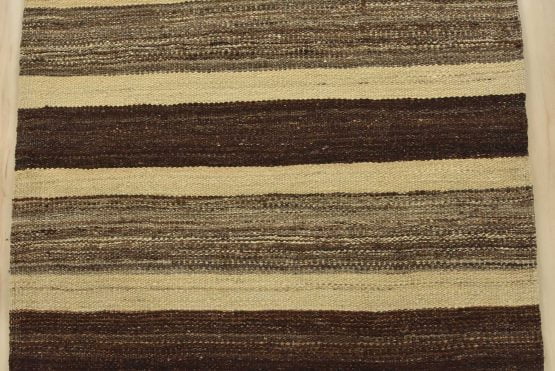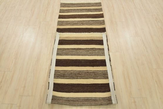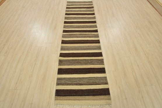 A contemporary Kilim runner handwoven with wool on a cotton foundation. This rug features horizontal stripes. It is new and in excellent condition.