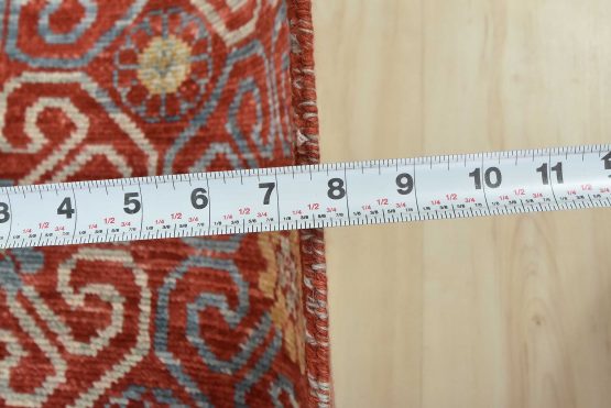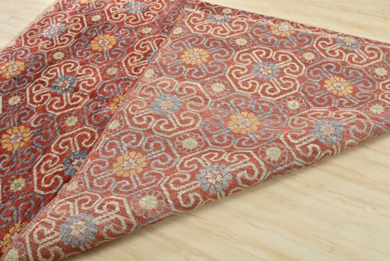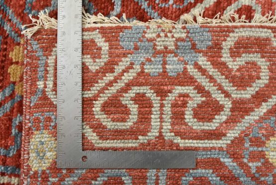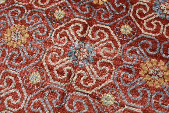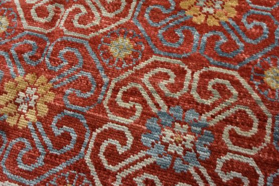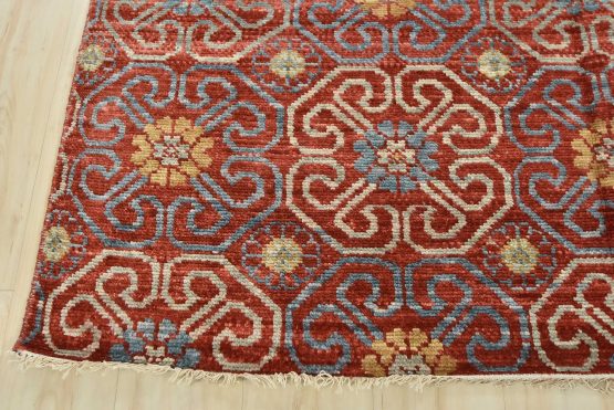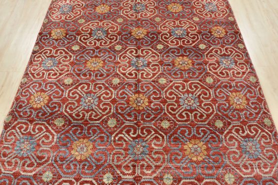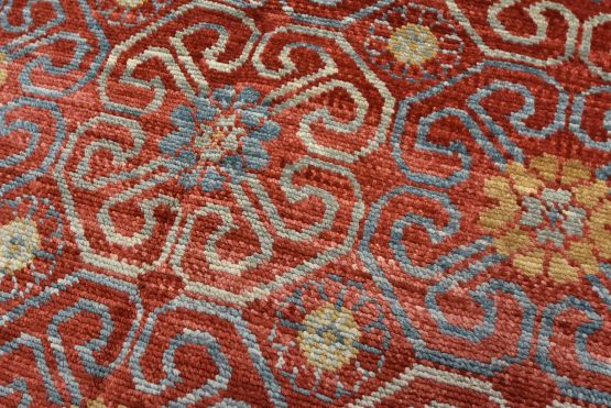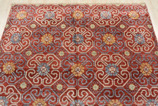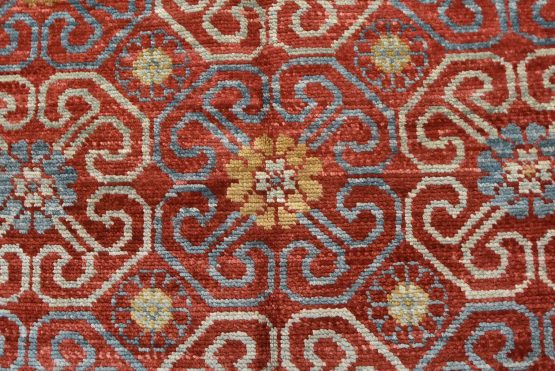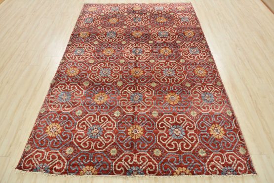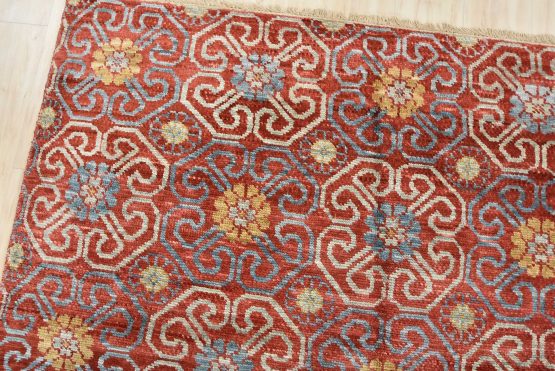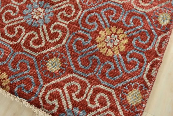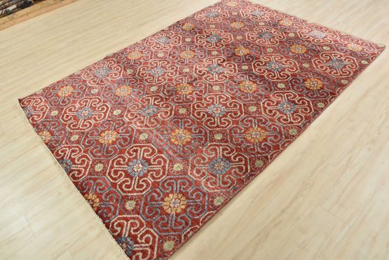 A Modern rug hand-knotted with an all-wool pile on a cotton foundation. This oriental rug features rows of botanical motifs set against a red background. It is new and in excellent condition.