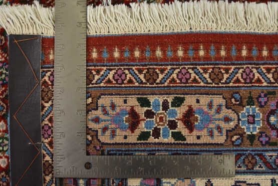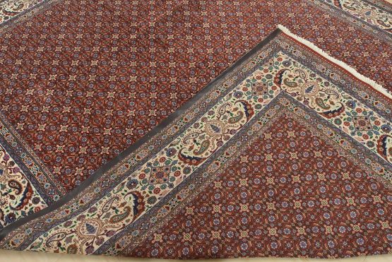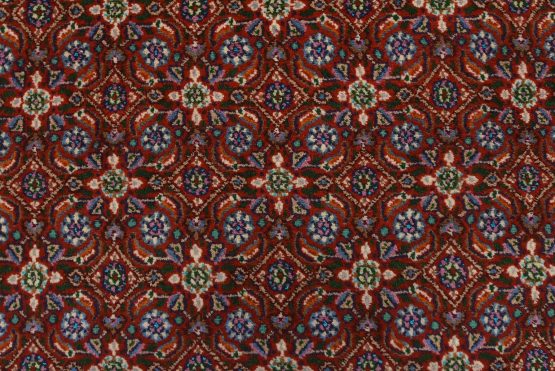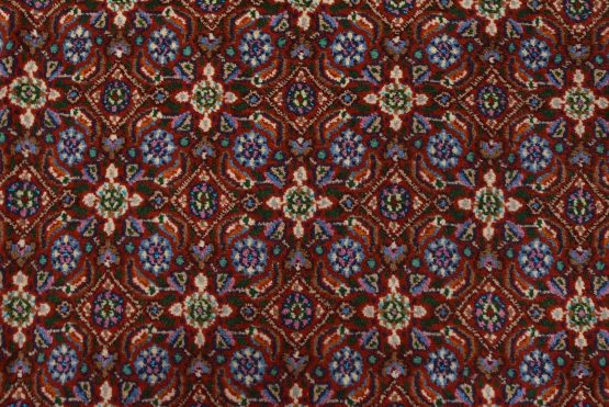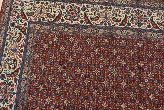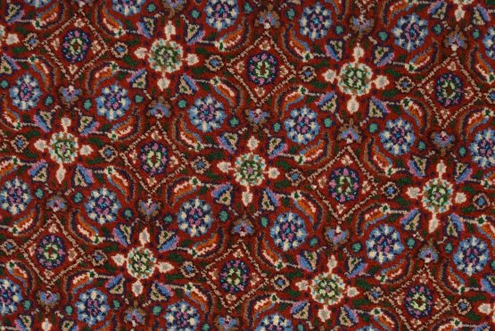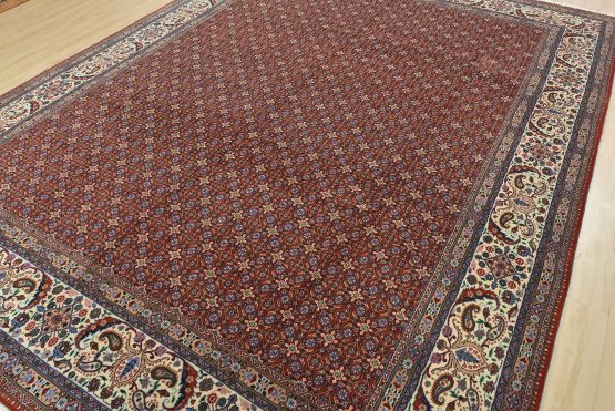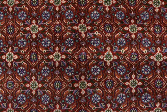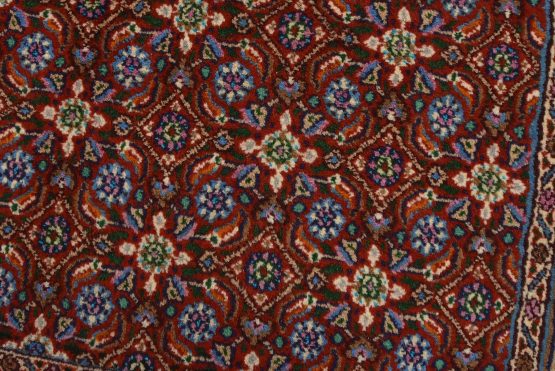 An authentic vintage traditional Mood rug hand-knotted with an all-wool pile on a cotton foundation. This finely woven oriental rug features an intricate Herati pattern set against a red background. This rug has a full wool pile with no worn areas and is in very good condition.