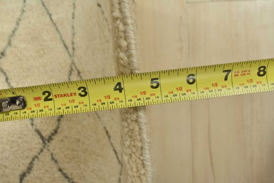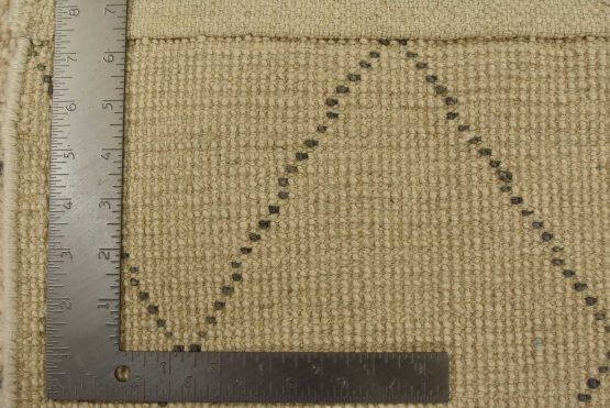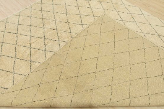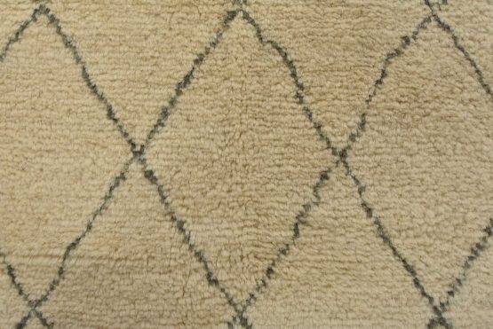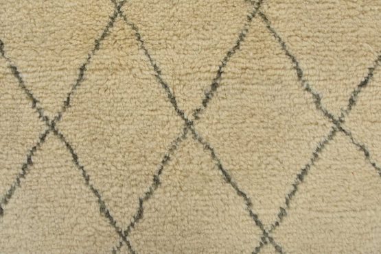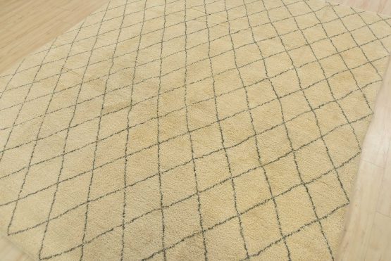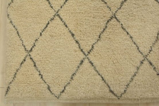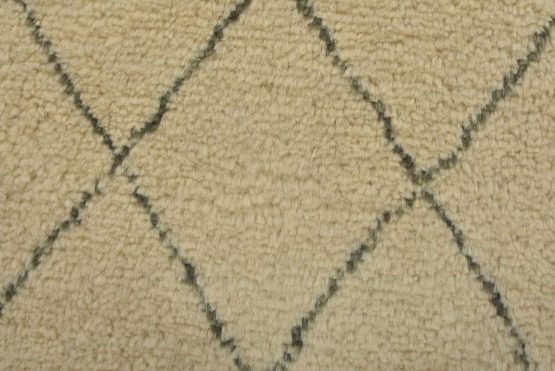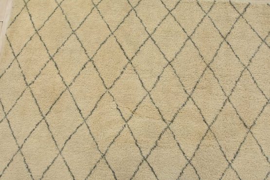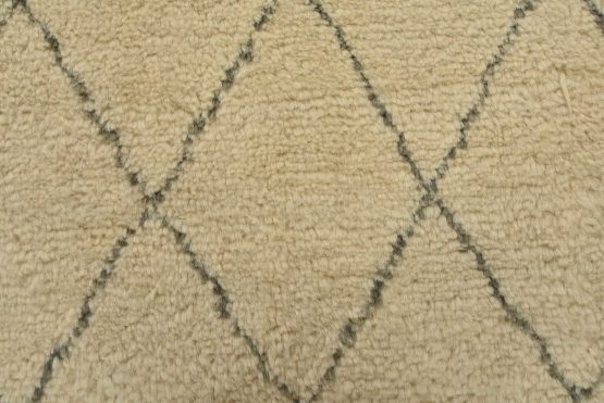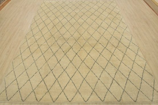 A contemporary Moroccan rug hand-knotted with an all-wool pile on a cotton foundation. This area rug features an all-over diamond-shaped geometric pattern set against an ivory background. It is new and in excellent condition.