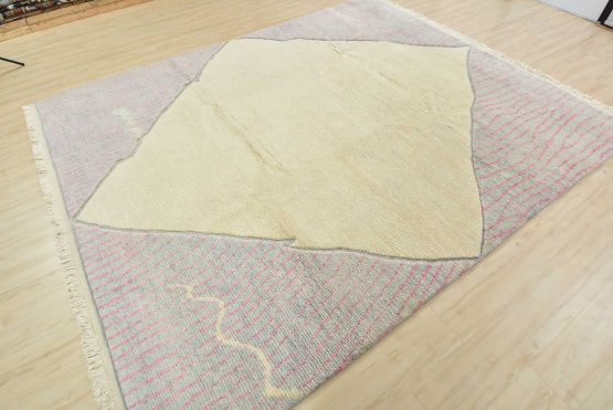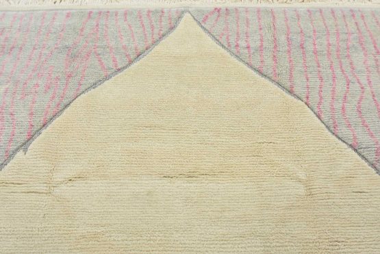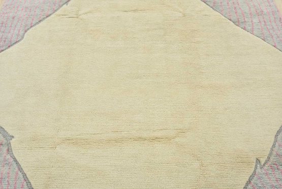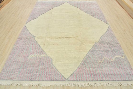 A contemporary Moroccan rug hand-knotted with an all-wool pile on a cotton foundation. This plush area rug features a solid ivory background adorned with geometric designs in the spandrels. It is new and in excellent condition.