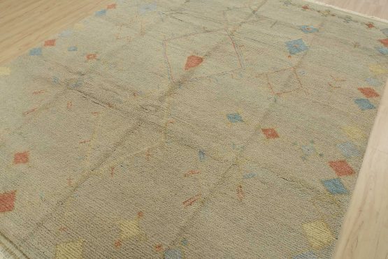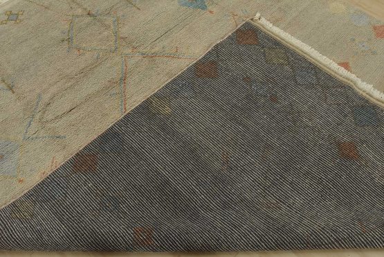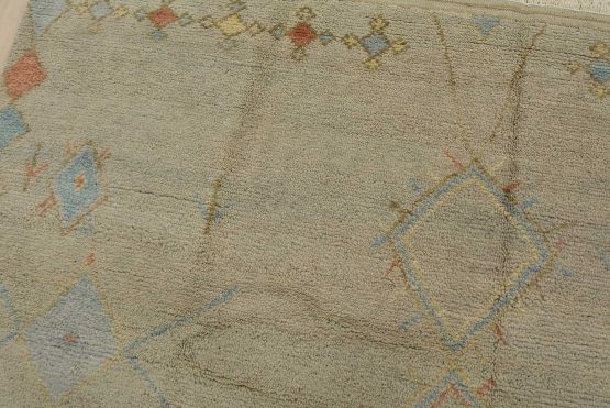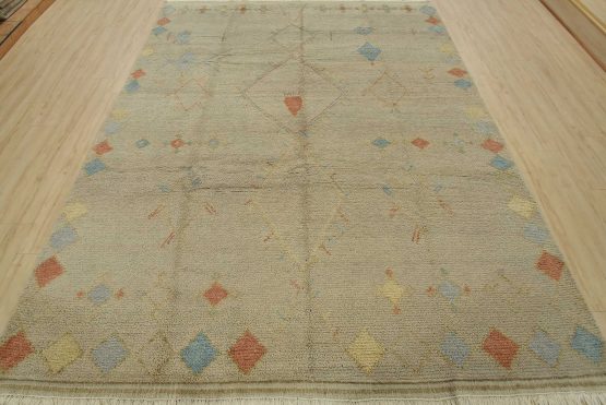 A contemporary Moroccan rug hand-knotted with an all-wool pile on a cotton foundation. This area rug features diamond-shaped medallions surrounded by geometric motifs set against a gray background. It is new and in excellent condition.