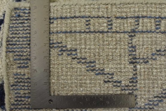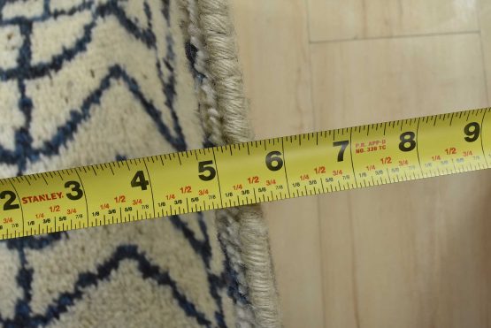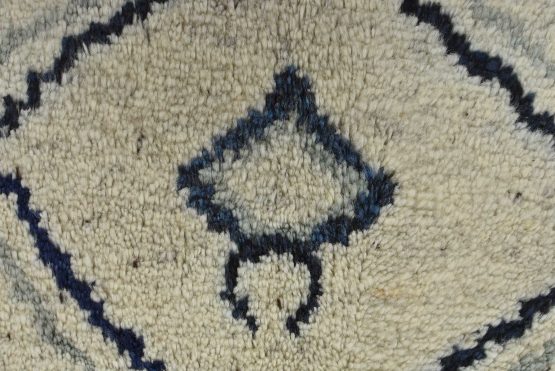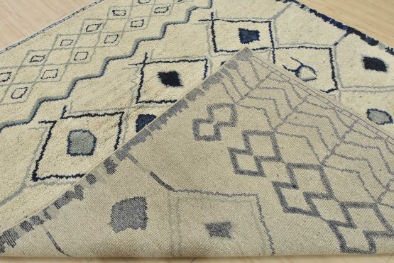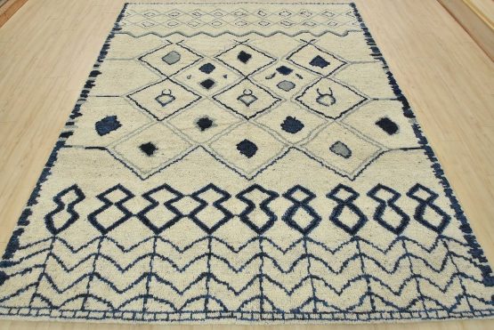 A tribal contemporary Moroccan rug hand-knotted with an all-wool pile on a cotton foundation. This area rug features all-over geometric patterns set against an Ivory background. It is new and in excellent condition.