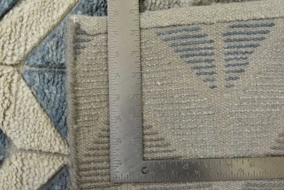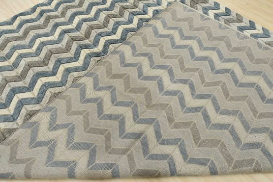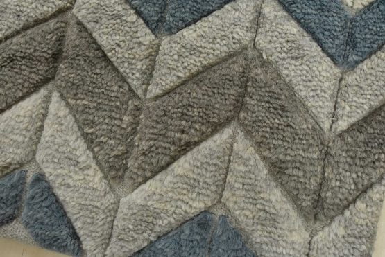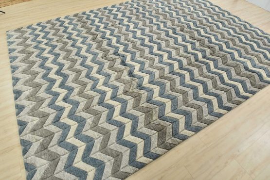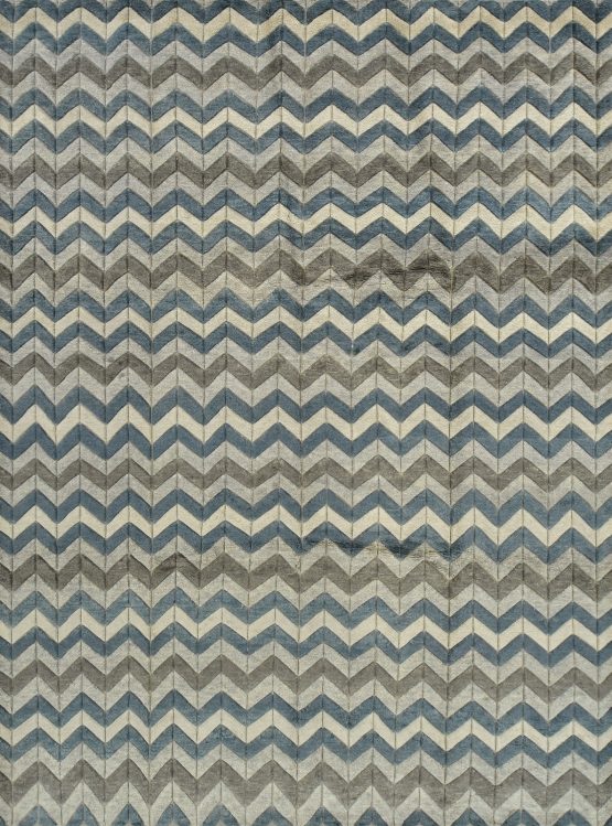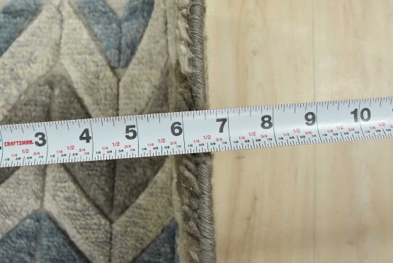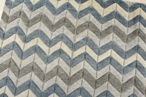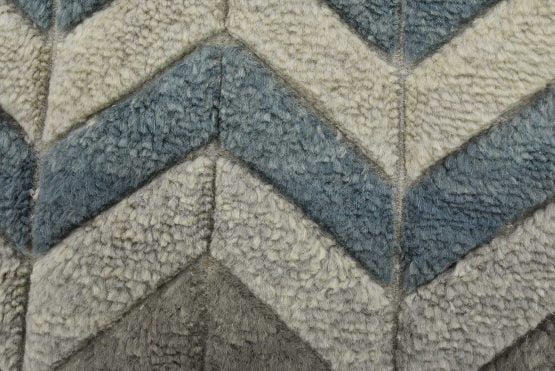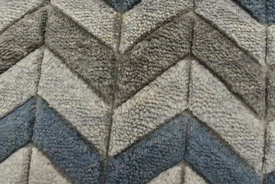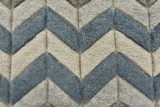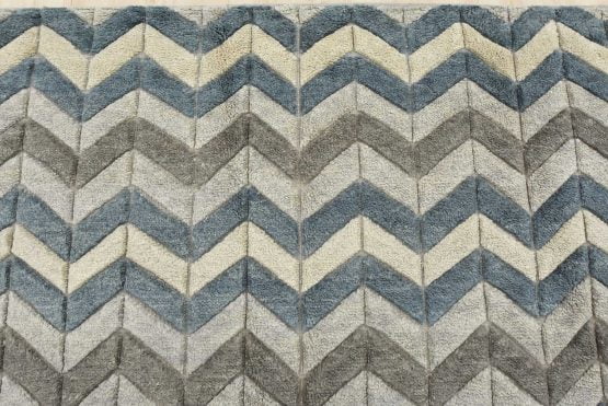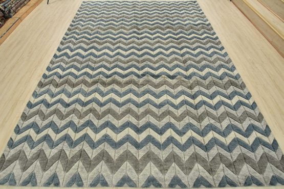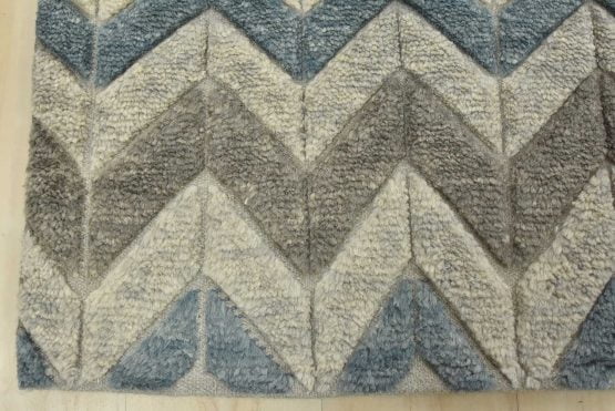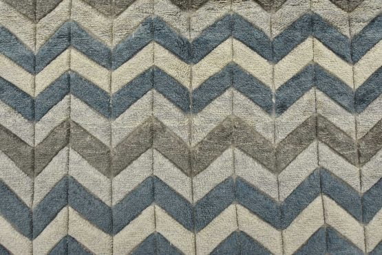 A contemporary Moroccan rug hand-knotted with an all-wool pile on a cotton foundation. This area rug features an all-over chevron pattern created with high and low wool pile heights. It is new and in excellent condition.