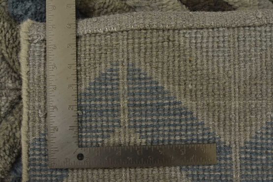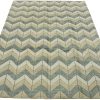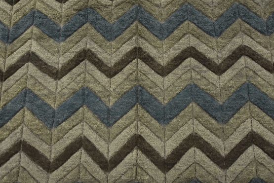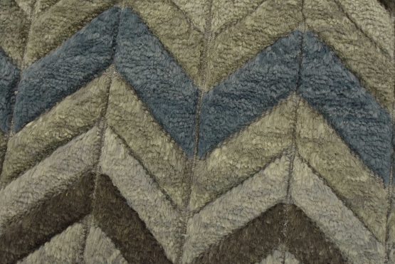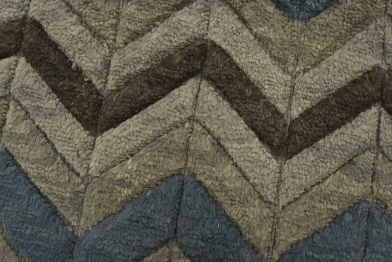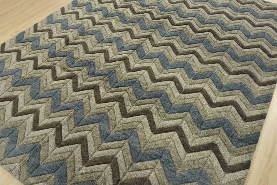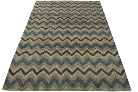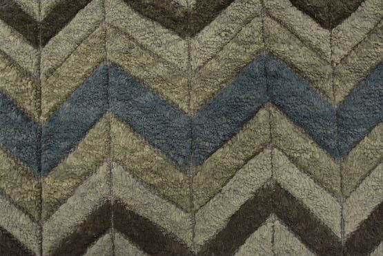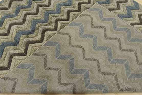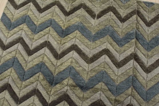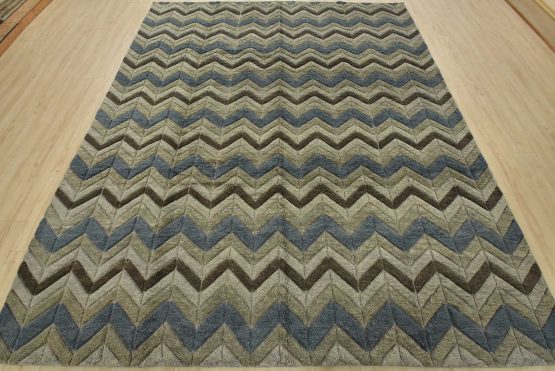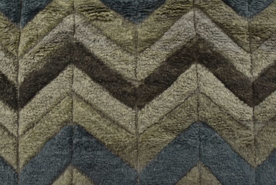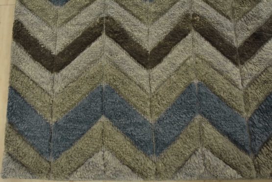 A contemporary Moroccan rug hand-knotted with an all-wool pile on a cotton foundation. This plush area rug features a chevron pattern in shades of blue and gray, showcasing varied pile heights. It is new and in excellent condition.