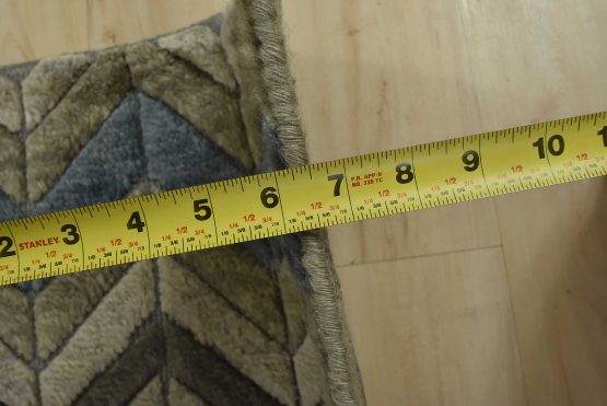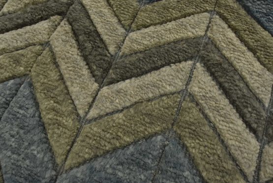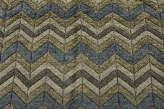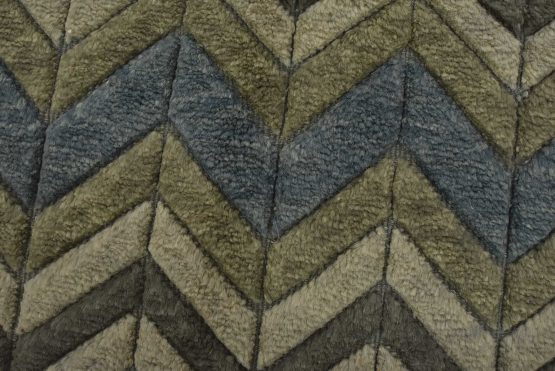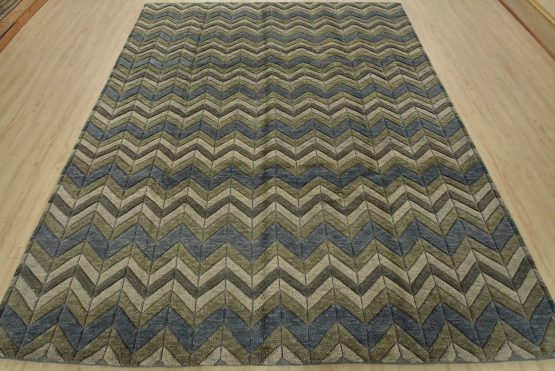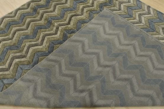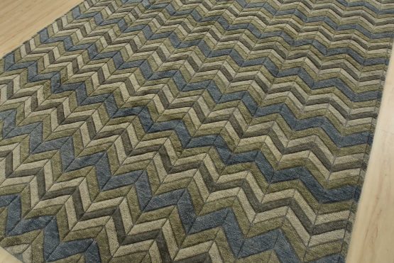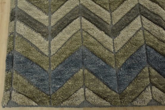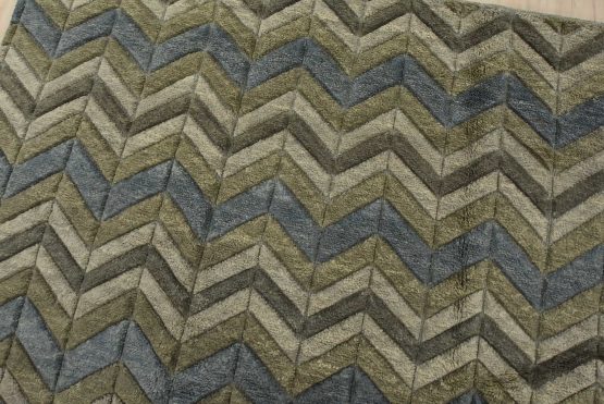 A contemporary Moroccan rug hand-knotted with an all-wool pile on a cotton foundation. This plush area rug features a chevron pattern in shades of blue and gray, showcasing varied pile heights. It is new and in excellent condition.