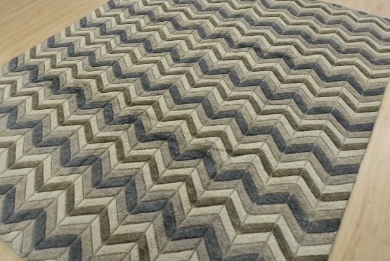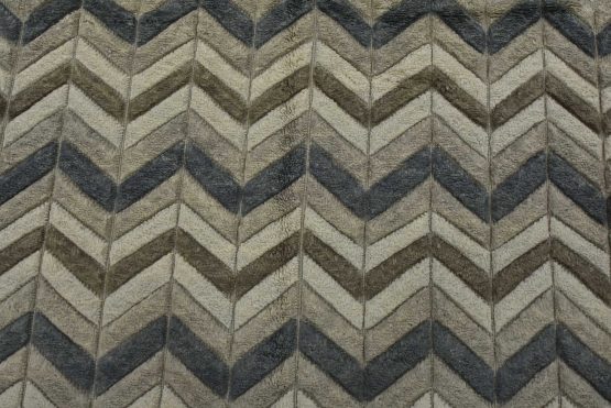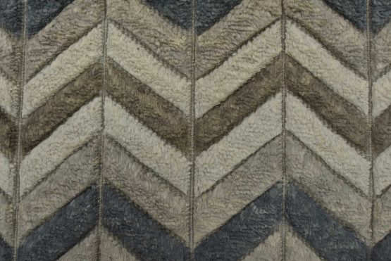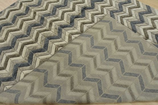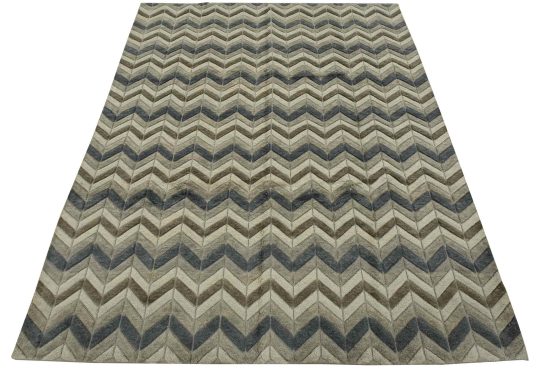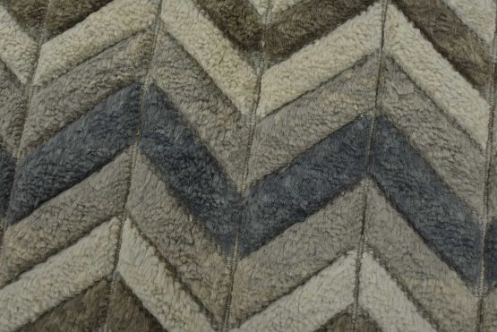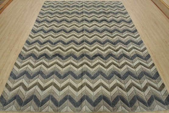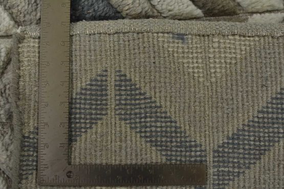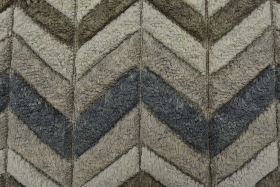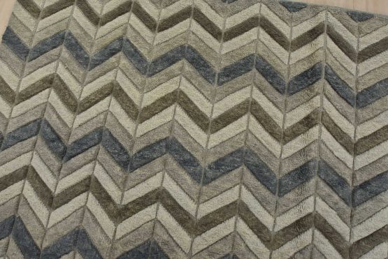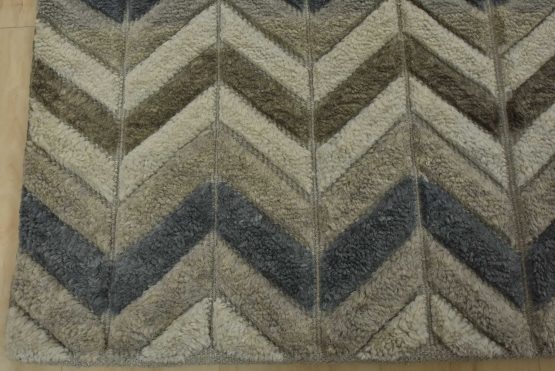 A contemporary Moroccan rug hand-knotted with an all-wool pile on a cotton foundation. This plush area rug features a chevron pattern in shades of blue and gray, showcasing varied pile heights. It is new and in excellent condition.
