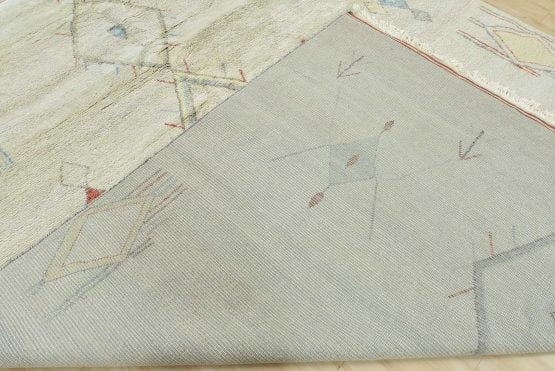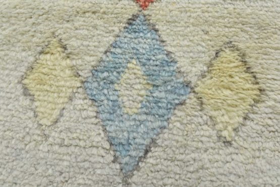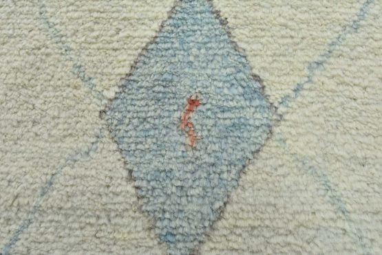 A contemporary Moroccan rug hand-knotted with an all-wool pile on a cotton foundation. This area rug features diamond-shaped medallions surrounded by geometric motifs set against a light blue background. It is new and in excellent condition.