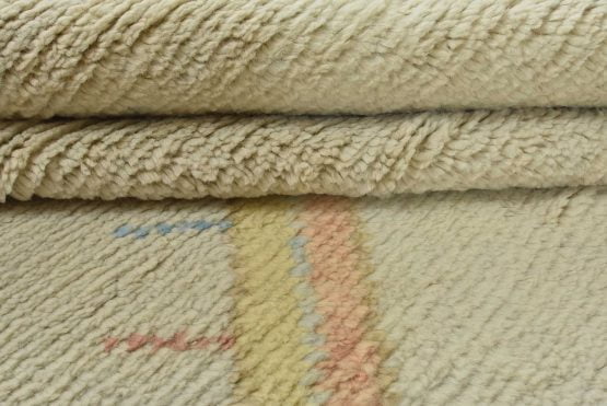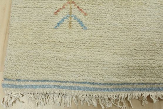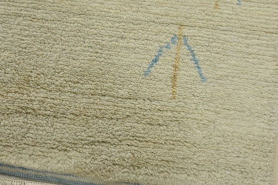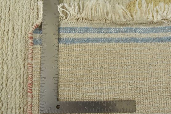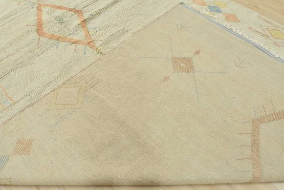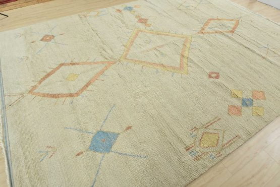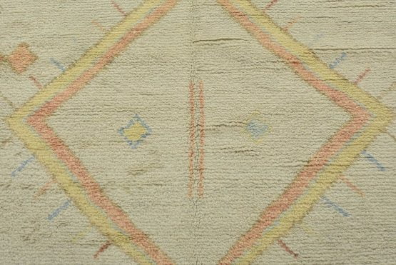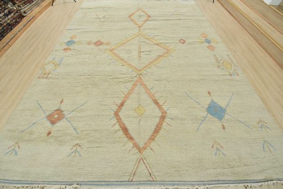 A contemporary Moroccan rug hand-knotted with an all-wool pile on a cotton foundation. This area rug features a central geometric medallion surrounded by geometric motifs set against an ivory background. It is new and in excellent condition.