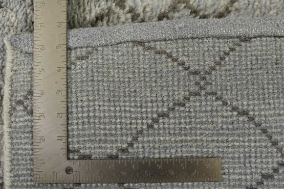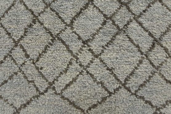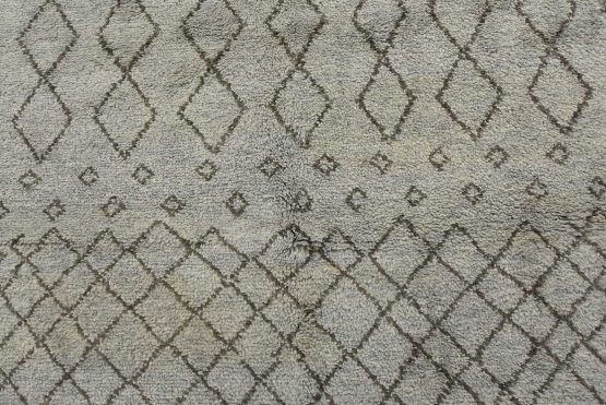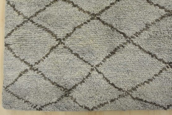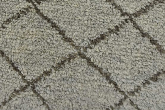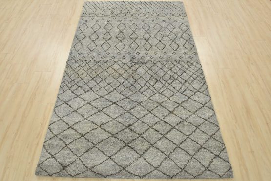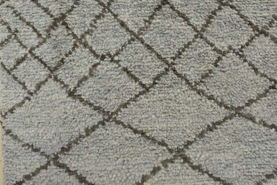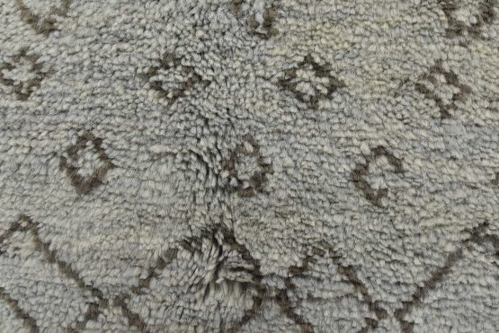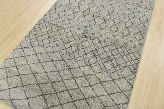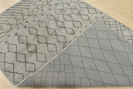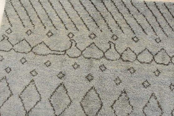 A contemporary Moroccan rug hand-knotted with an all-wool pile on a cotton foundation. This area rug features geometric patterns set against a gray background. It is new and in excellent condition.