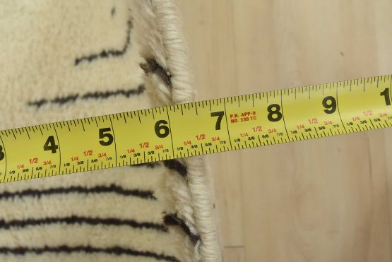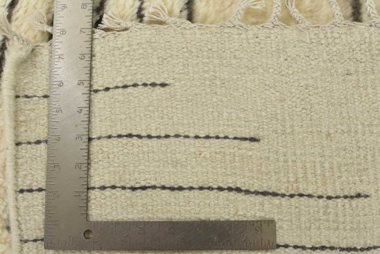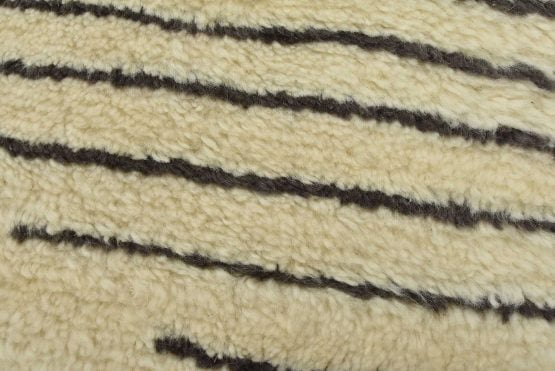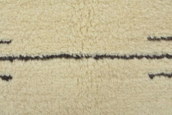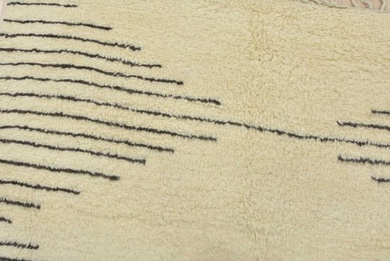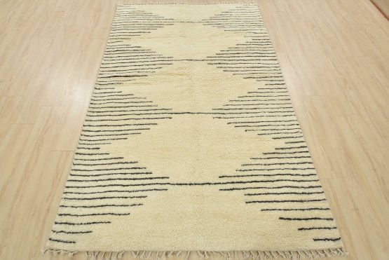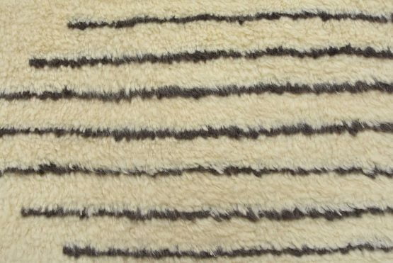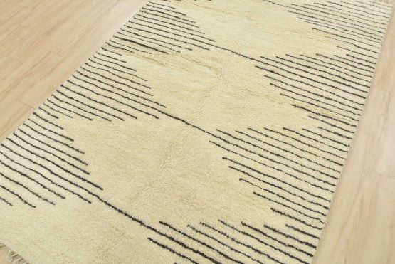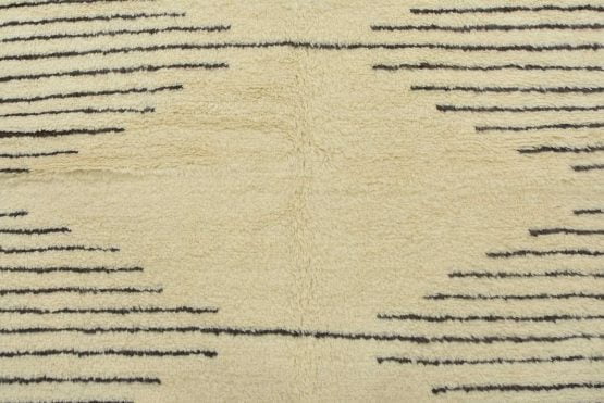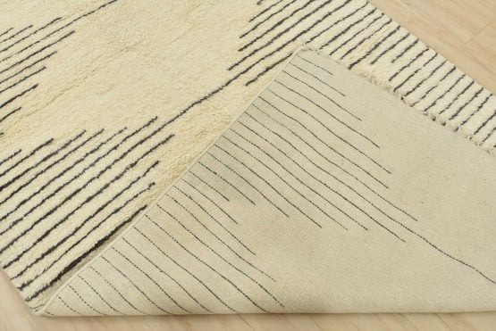 A contemporary Moroccan rug hand-knotted with an all-wool pile on a cotton foundation. This plush area rug features a pattern of lines creating solid ivory medallions. It is new and in excellent condition.