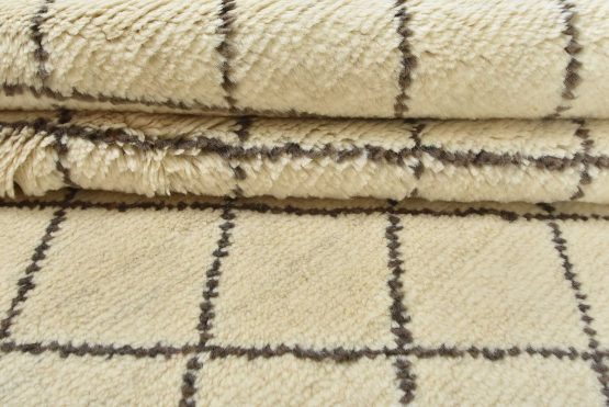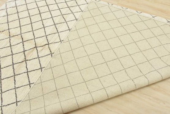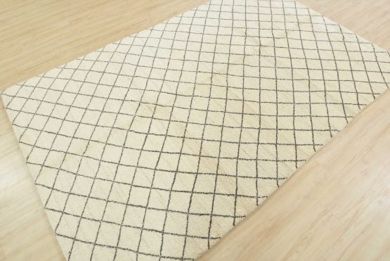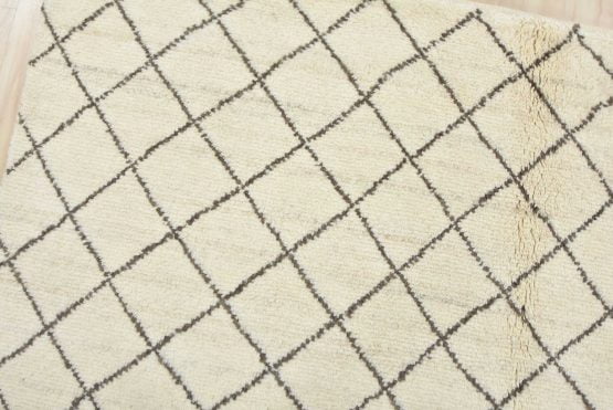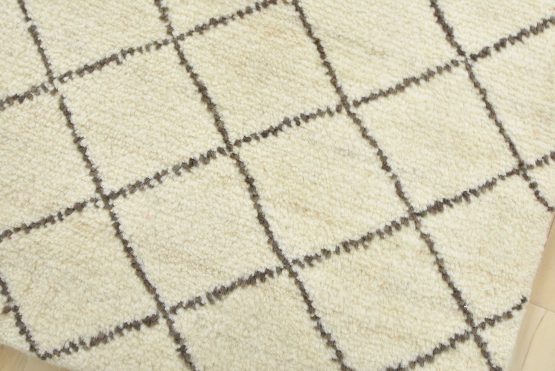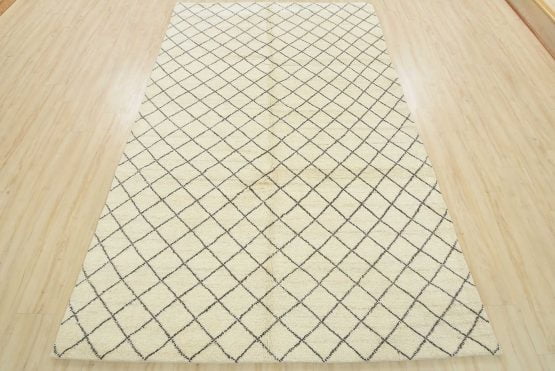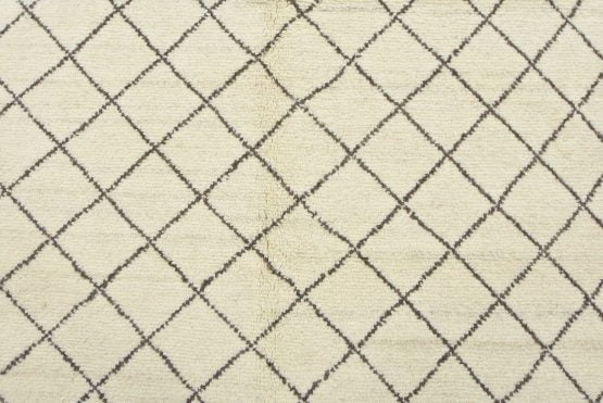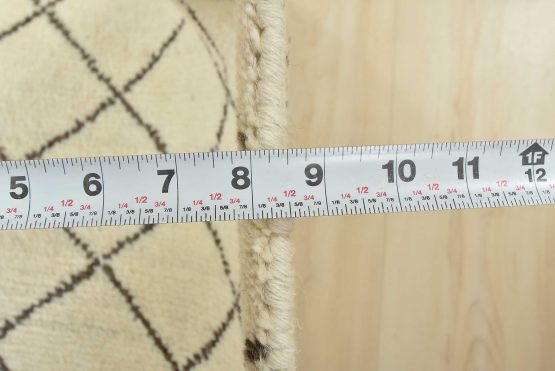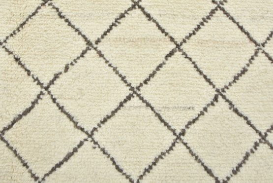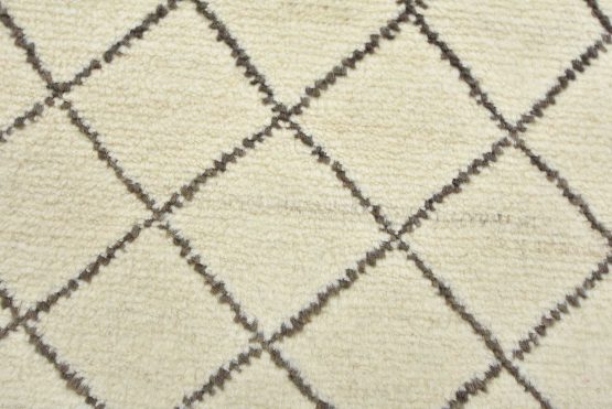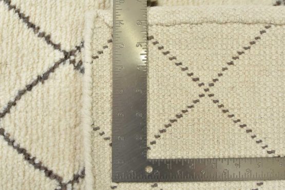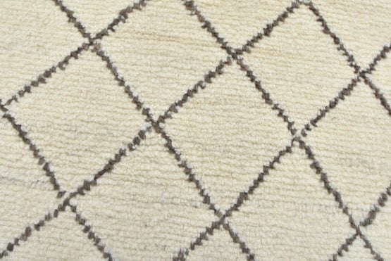 A contemporary Moroccan rug hand-knotted with an all-wool pile on a cotton foundation. This plush area rug features an all-over geometric pattern set against an ivory-colored background. It is new and in excellent condition.