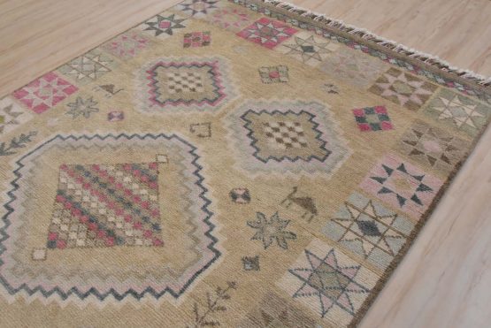 A contemporary Moroccan rug hand-knotted with an all-wool pile on a cotton foundation. This area rug features a geometric central medallion surrounded by smaller geometric medallions with motifs and animal figures. It is new and in excellent condition.