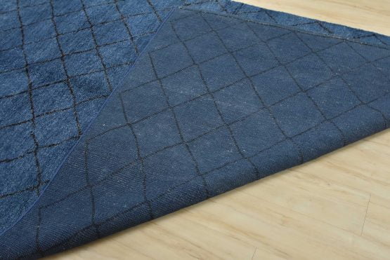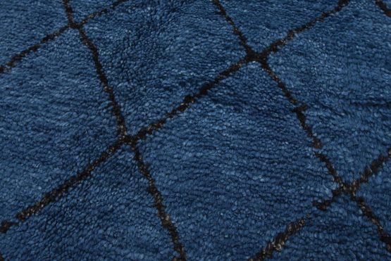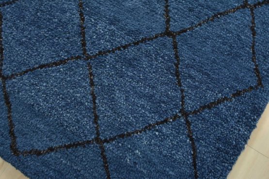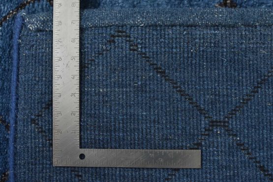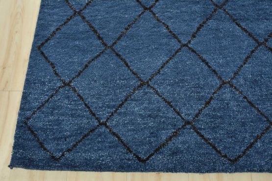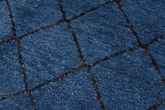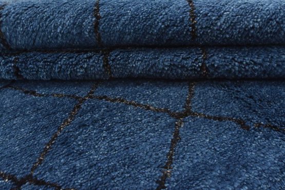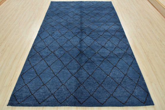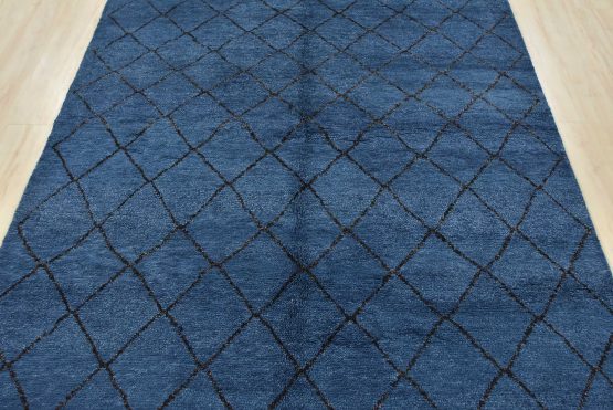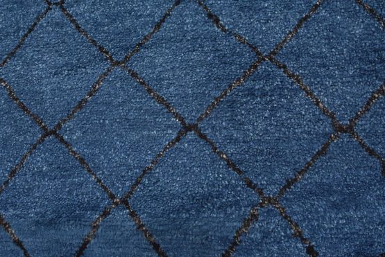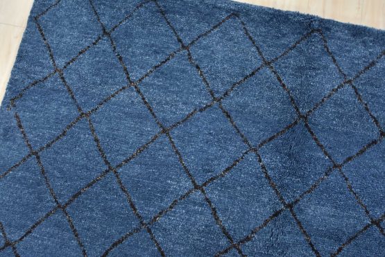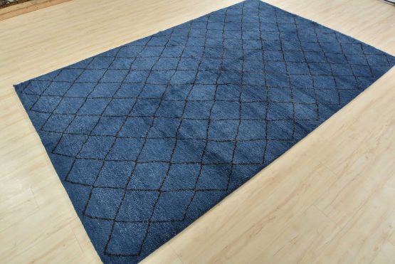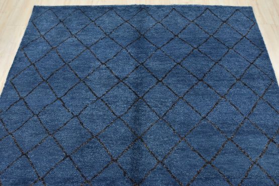 A contemporary Moroccan rug hand-knotted with an all-wool pile on a cotton foundation. This plush area rug features an all-over geometric pattern set against a blue background. It is new and in excellent condition.
