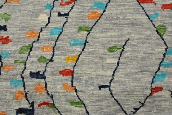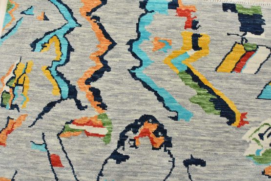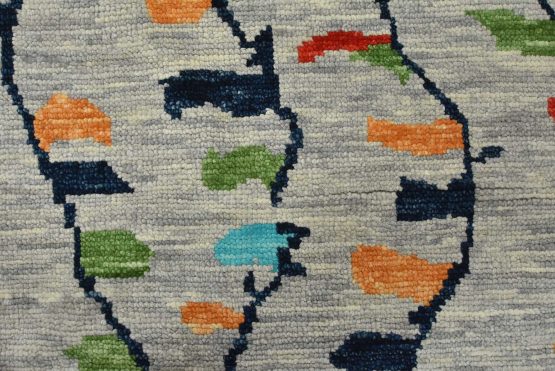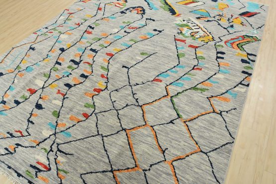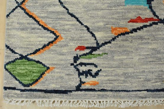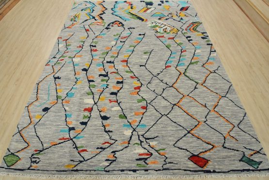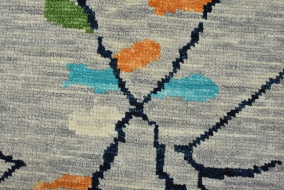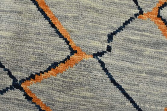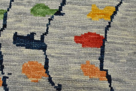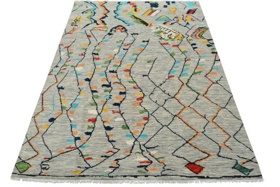 A contemporary Moroccan rug hand-knotted with an all-wool pile on a cotton foundation. This area rug features an all-over geometric design set against a gray background. It is new and in excellent condition.