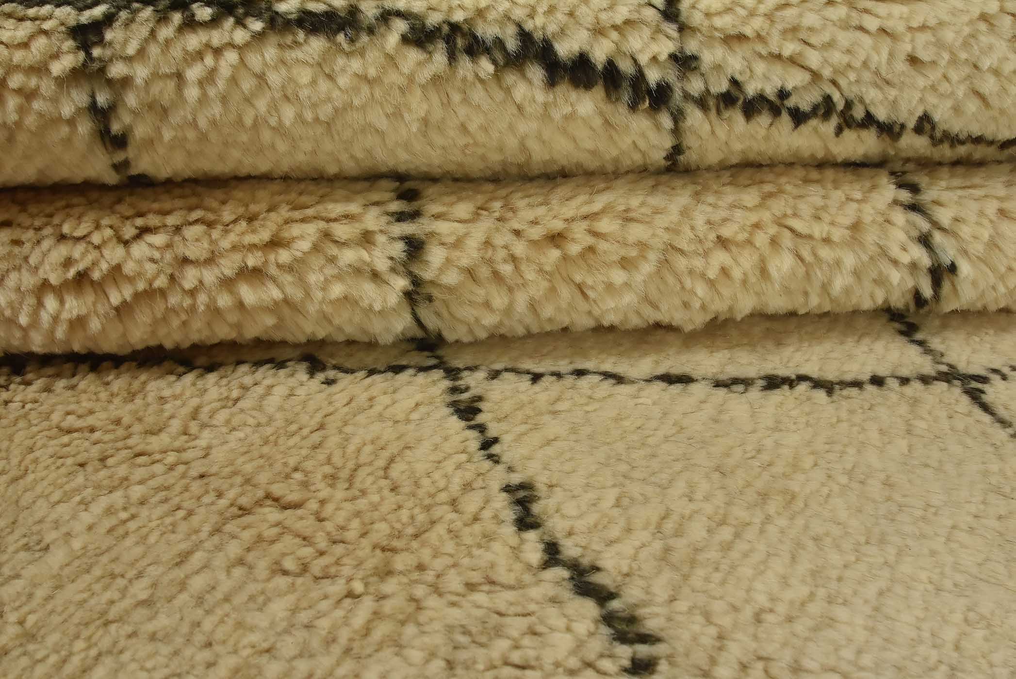 A contemporary Moroccan rug hand-knotted with an all-wool pile on a cotton foundation. This plush area rug features an all-over geometric pattern set against an ivory background. It is new and in excellent condition.