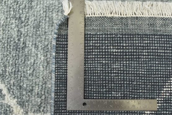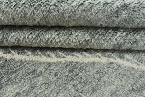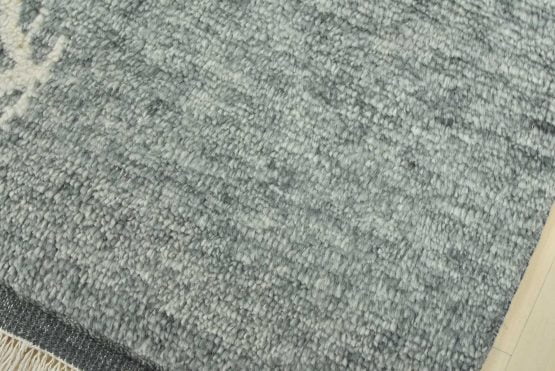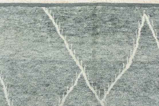 A contemporary Moroccan rug hand-knotted with an all-wool pile on a cotton foundation. This plush area rug features an all-over geometric design set against a gray background. It is new and in excellent condition.