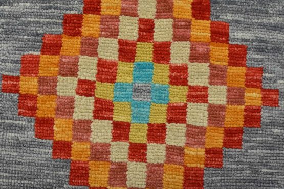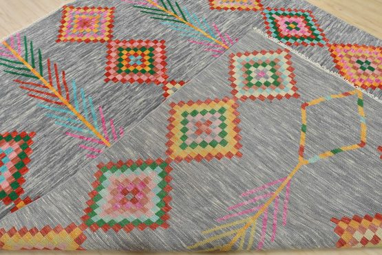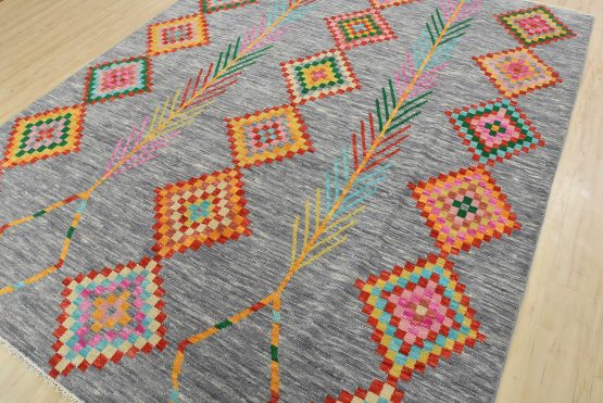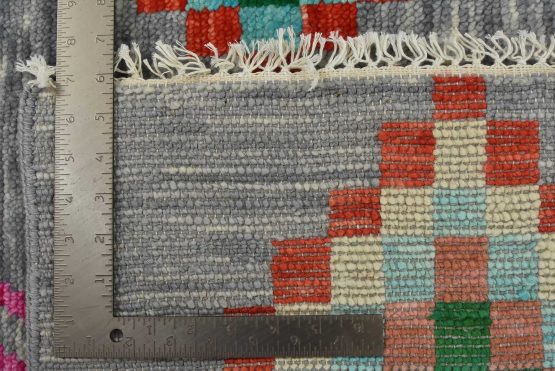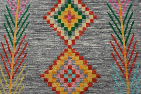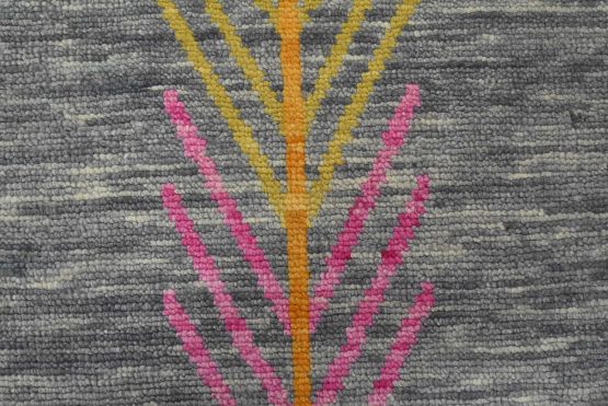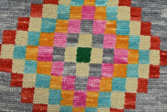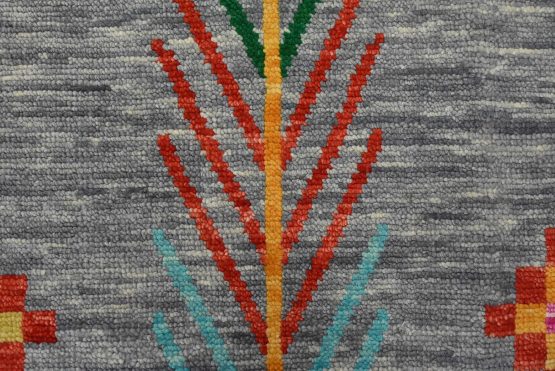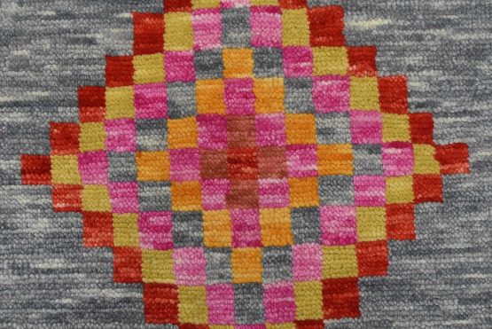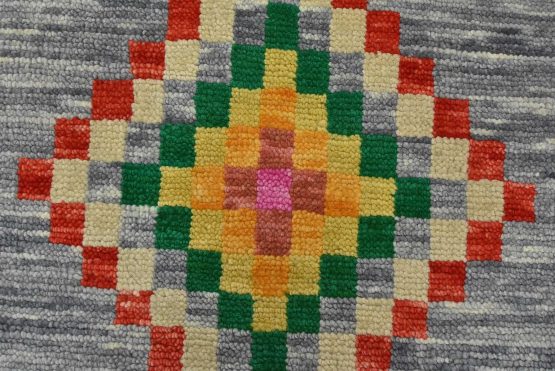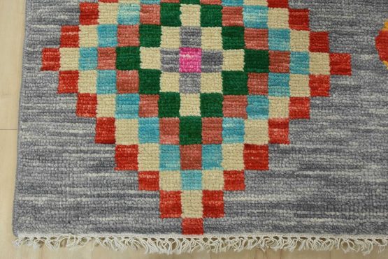 A contemporary Moroccan rug hand-knotted with an all-wool pile on a cotton foundation. The area rug features rows of geometric medallions adorned with botanical designs, all set against a gray background. It is new and in excellent condition.