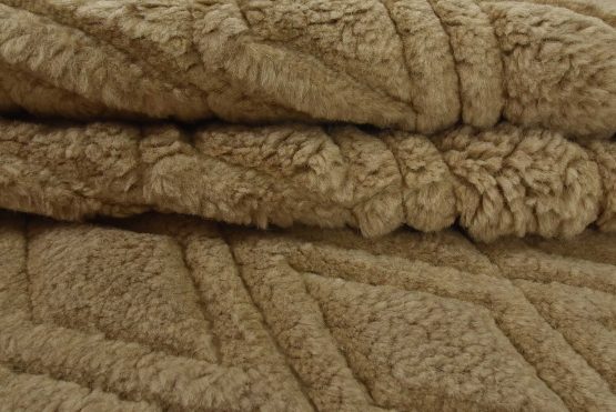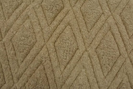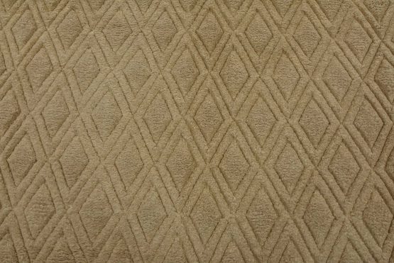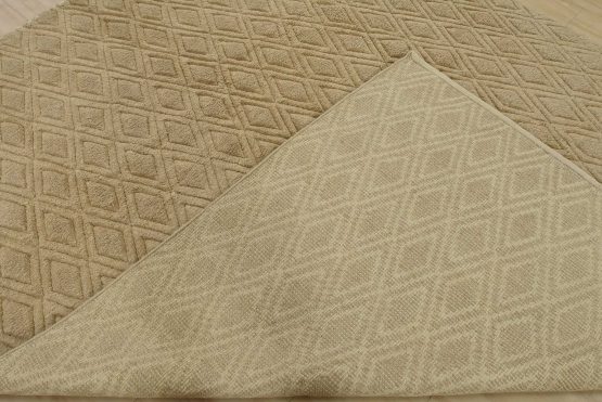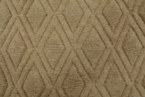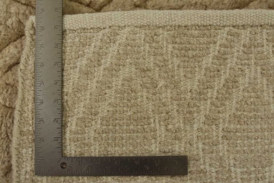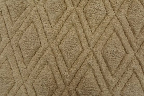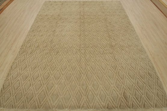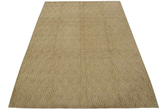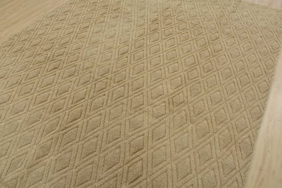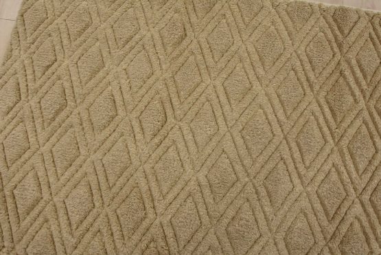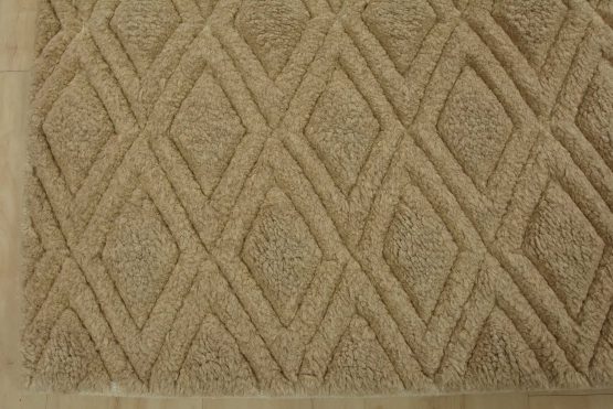 A contemporary Moroccan rug, hand-knotted with an all-wool pile on a cotton foundation. This plush area rug features a solid beige background with a geometric pattern intricately sculpted into the wool pile. It is new and in excellent condition.