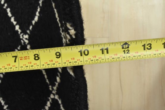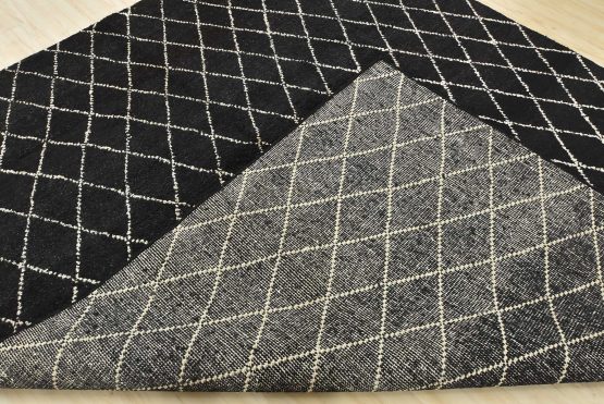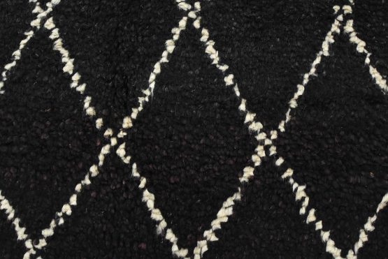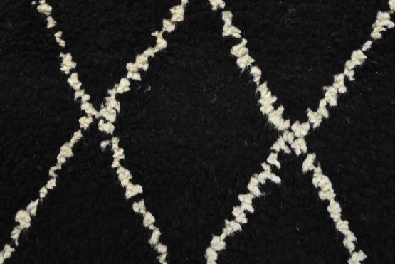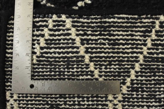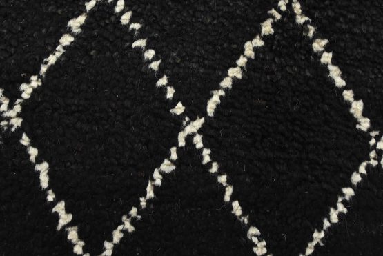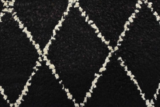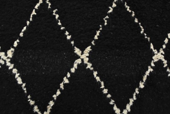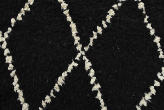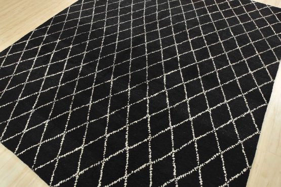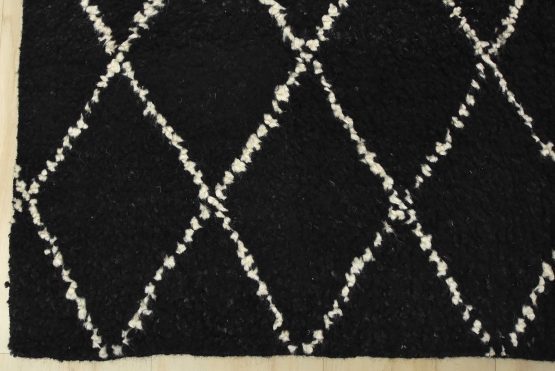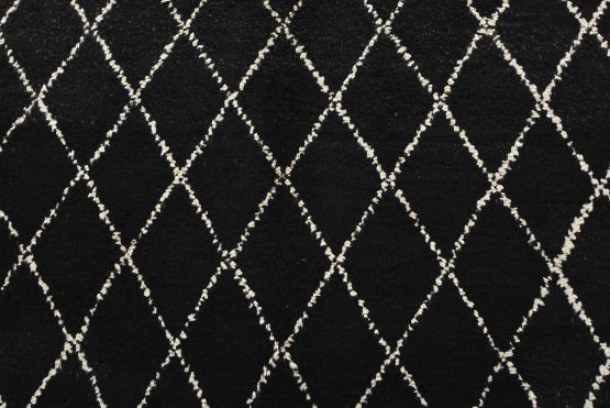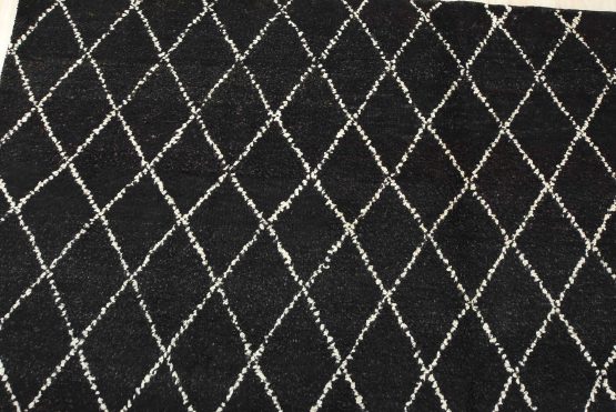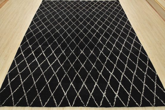 A contemporary Moroccan rug hand-knotted with an all-wool pile on a cotton foundation. This plush area rug features an all-over geometric pattern set against a black background. It is new and in excellent condition.