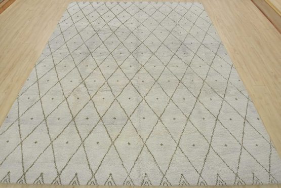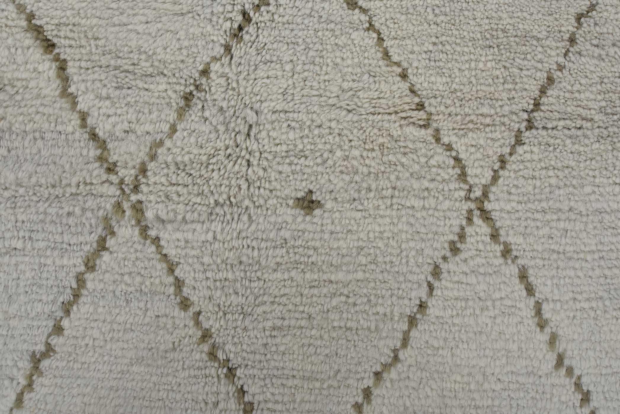 A contemporary Moroccan rug hand-knotted with an all-wool pile on a cotton foundation. This plush area rug features an all-over geometric pattern set against a gray background. It is new and in excellent condition.