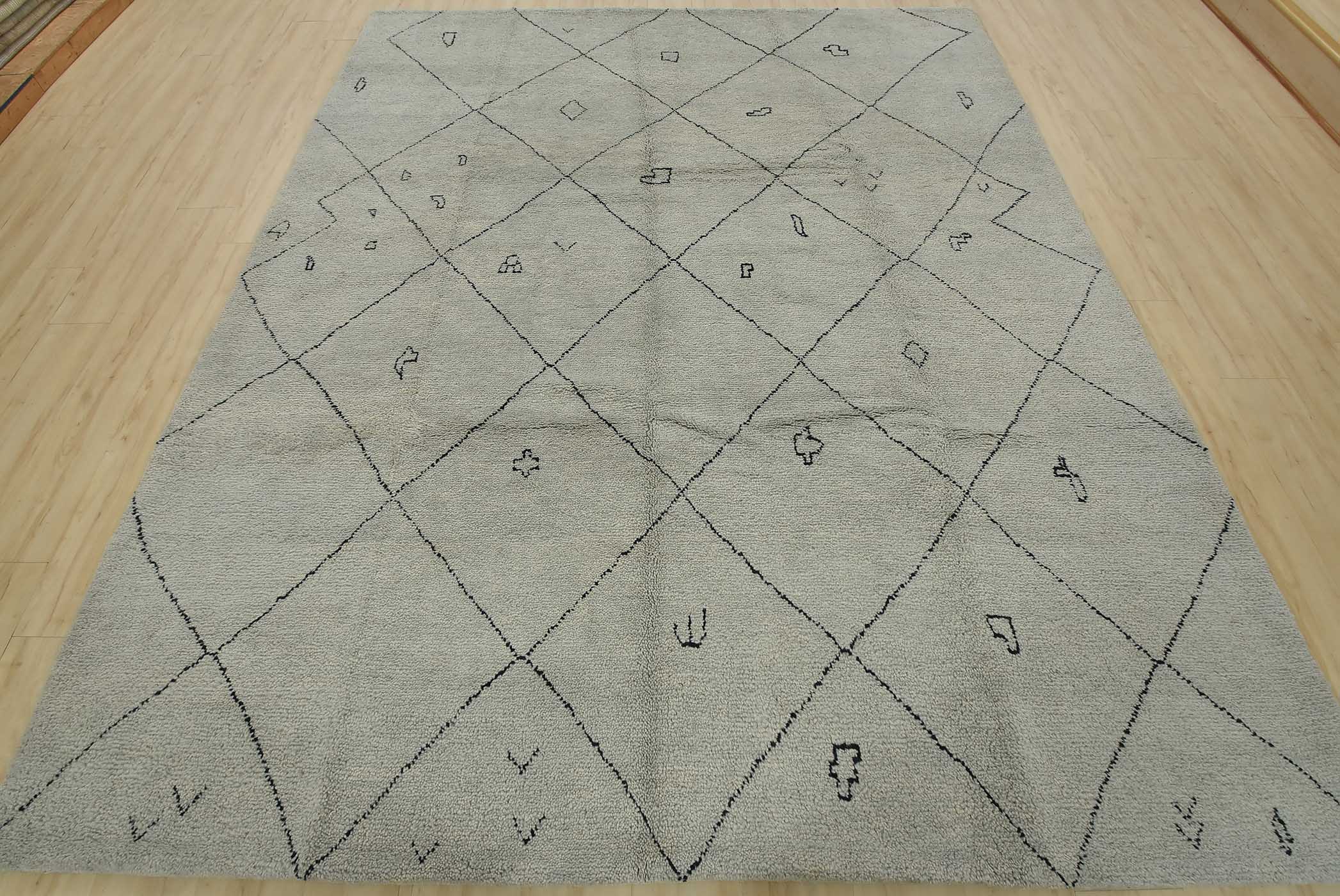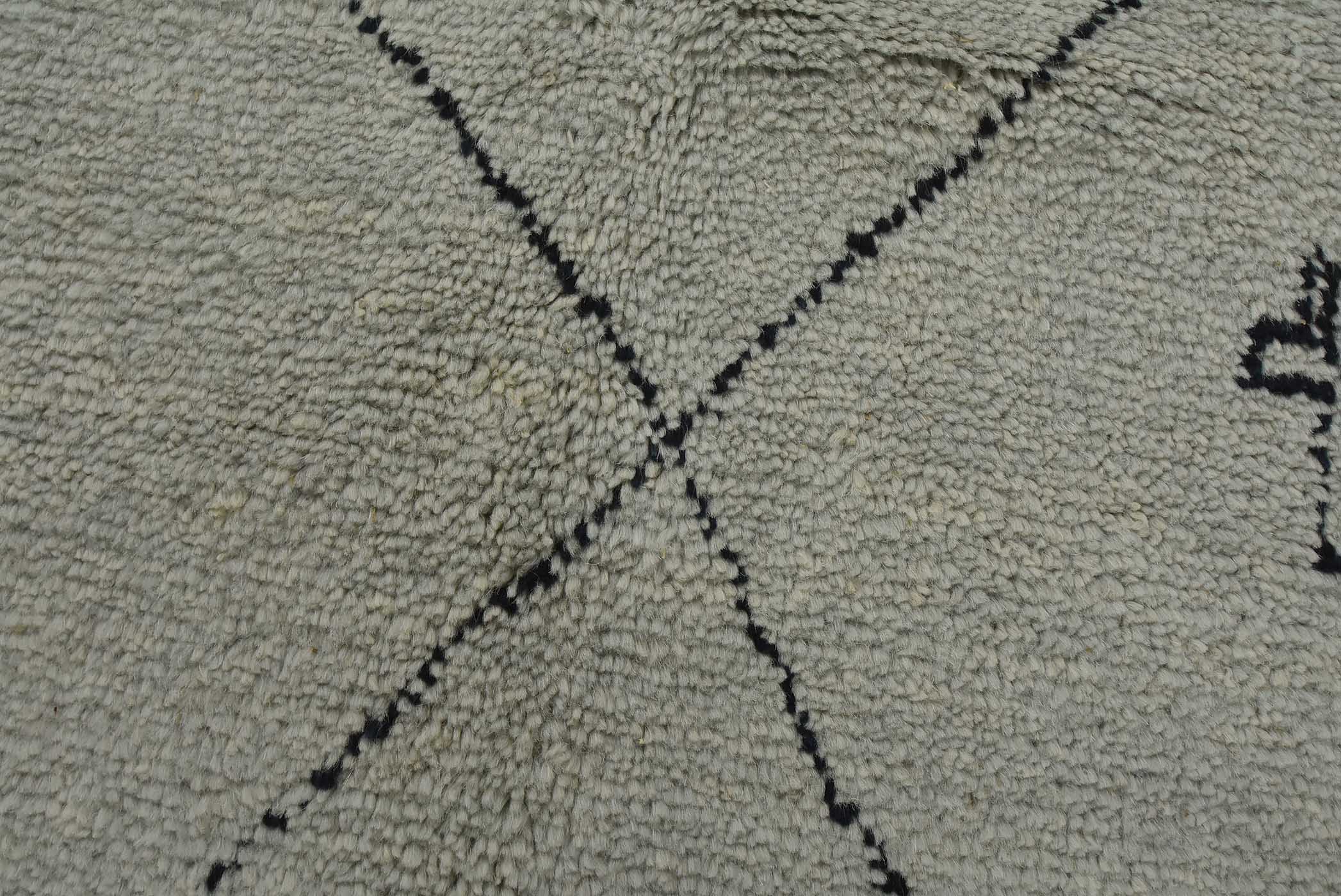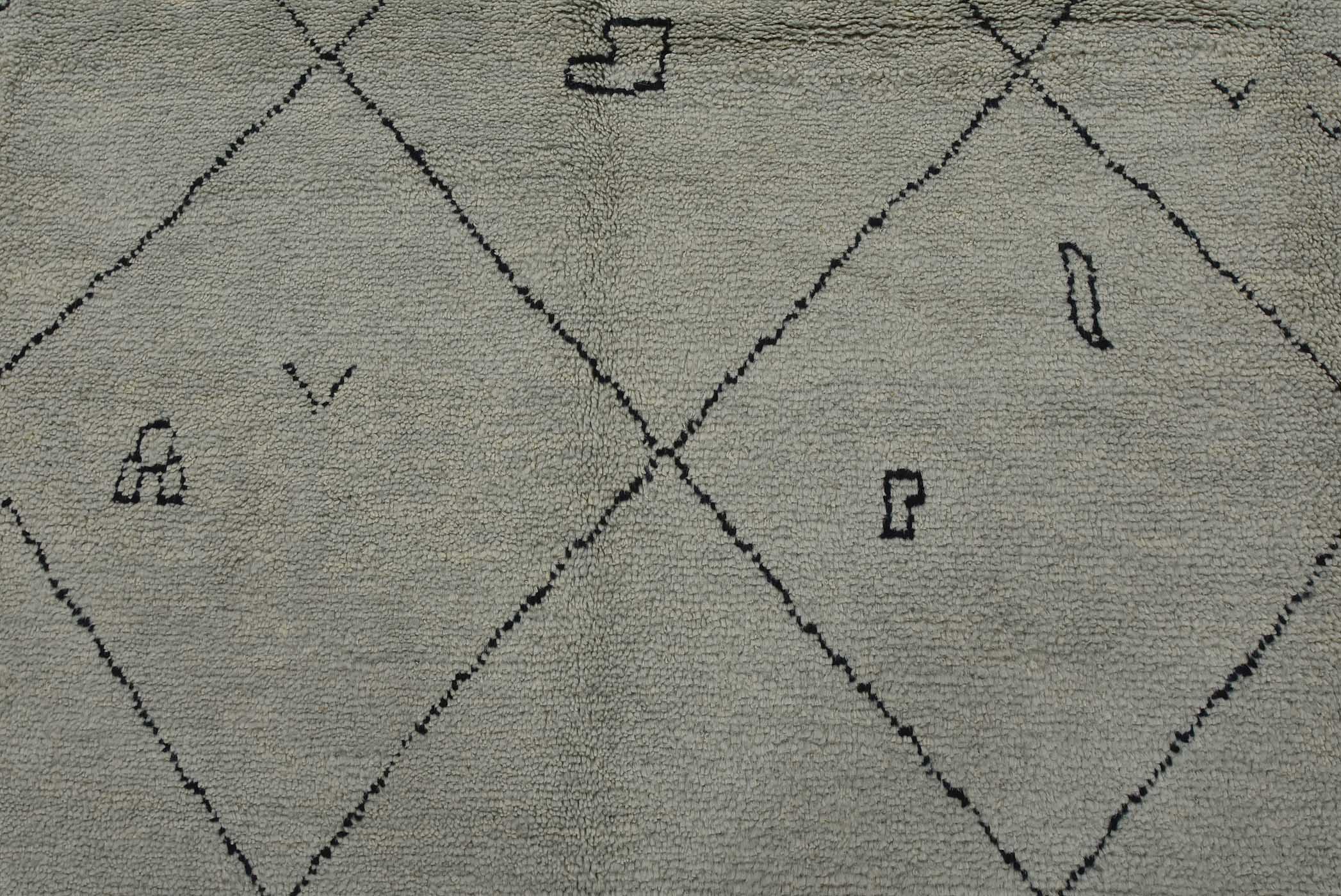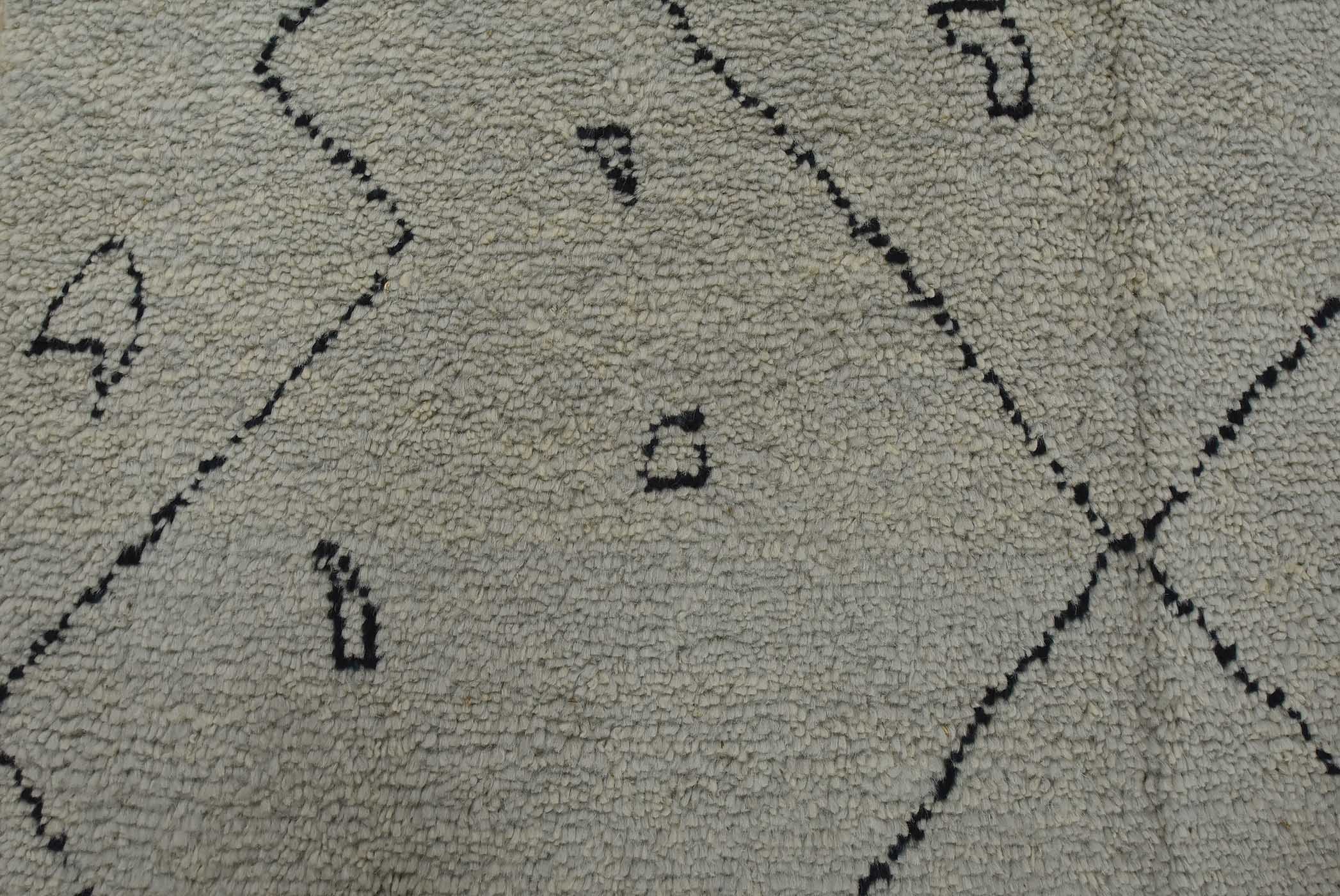 A contemporary Moroccan rug hand-knotted with an all-wool pile on a cotton foundation. This plush area rug features an all-over geometric pattern set against a gray background. It is new and in excellent condition.