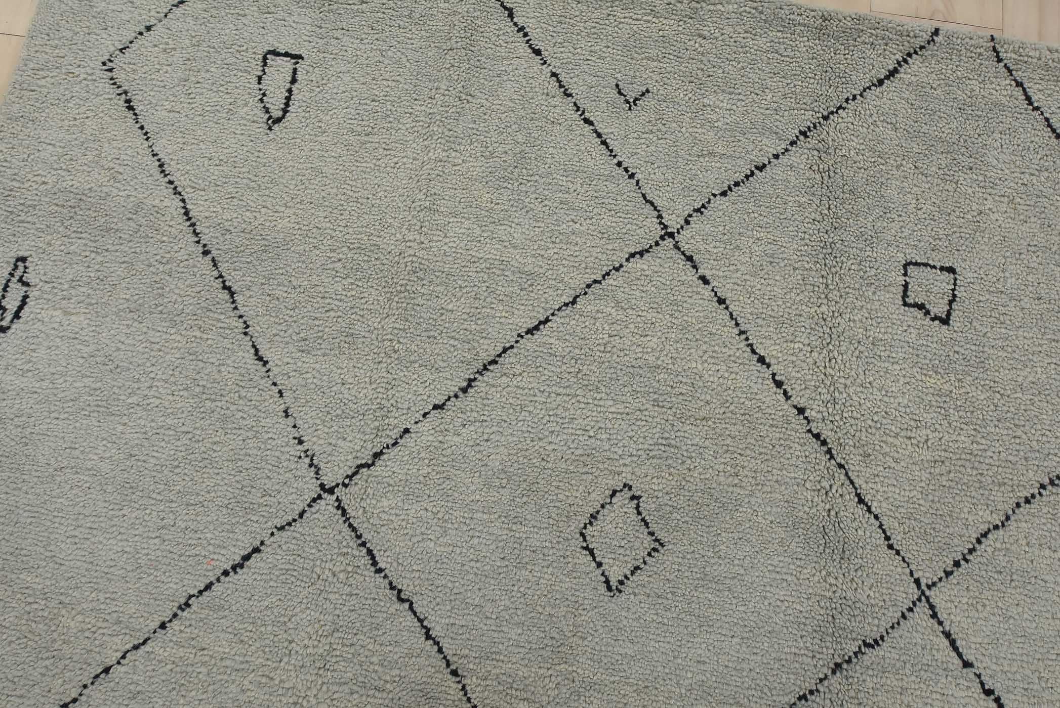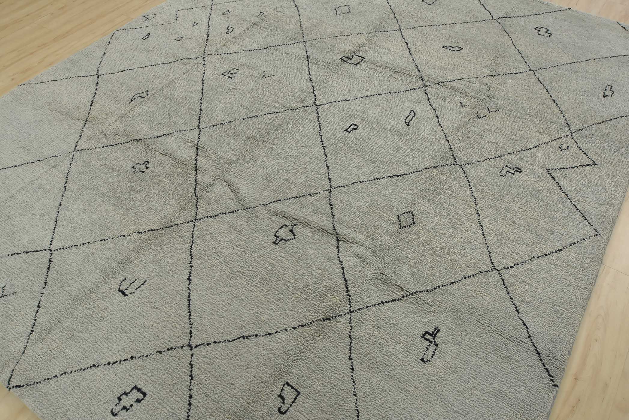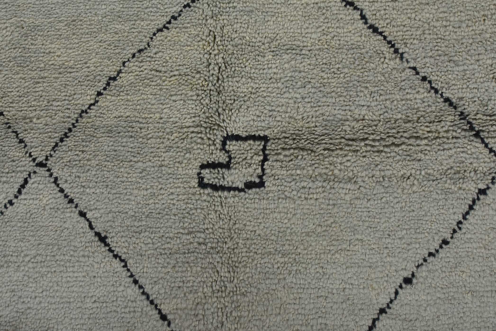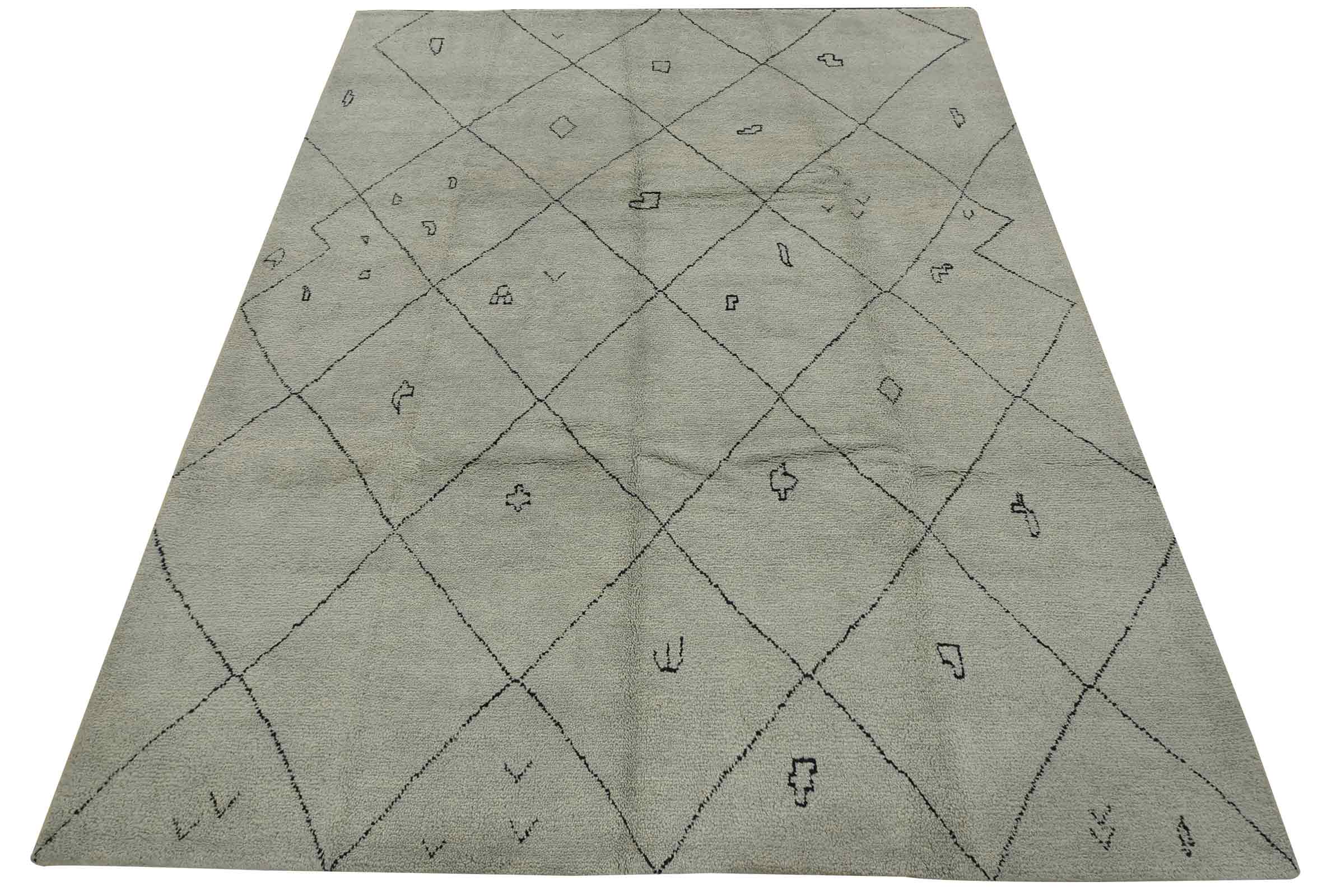 A contemporary Moroccan rug hand-knotted with an all-wool pile on a cotton foundation. This plush area rug features an all-over geometric pattern set against a gray background. It is new and in excellent condition.