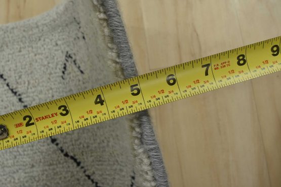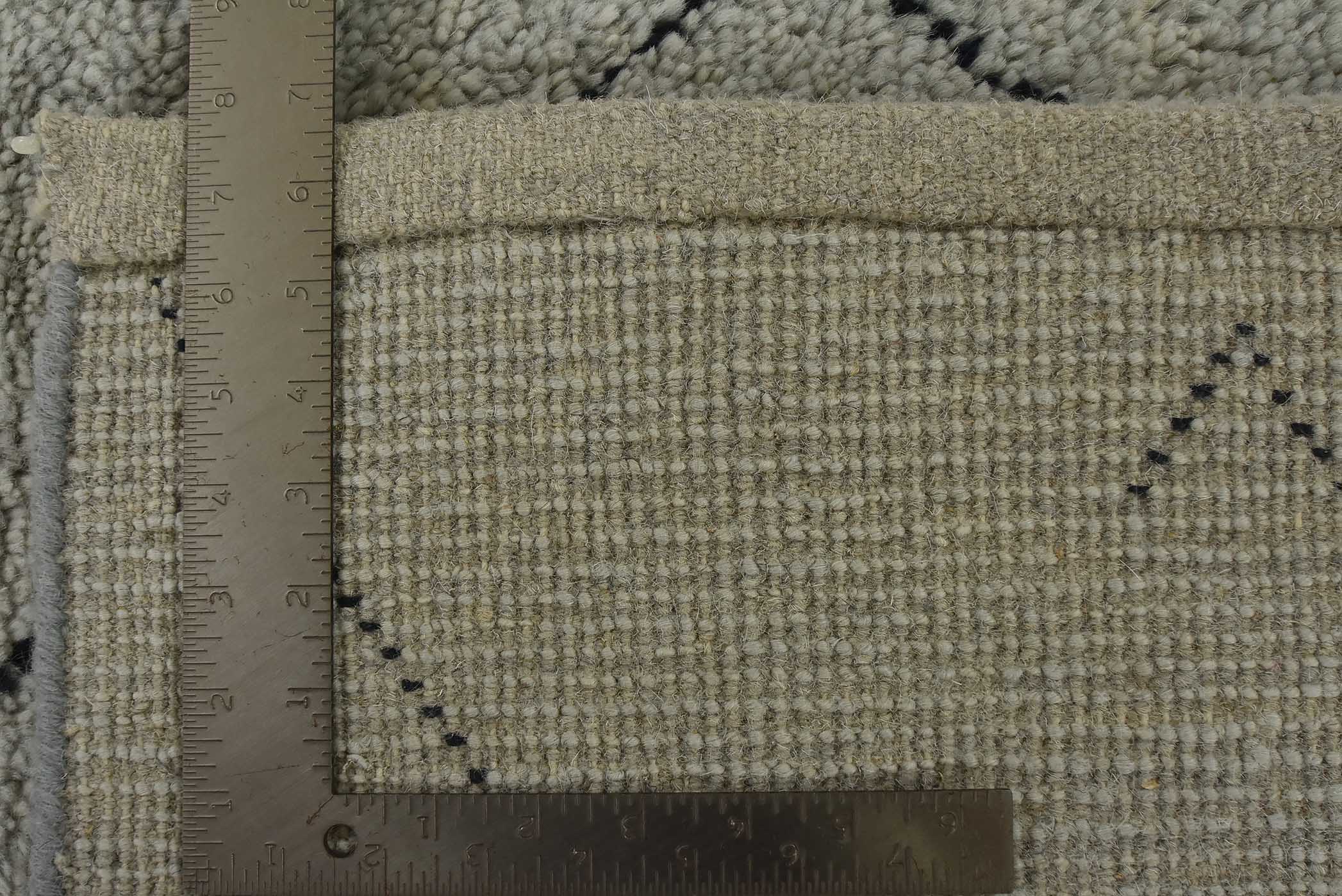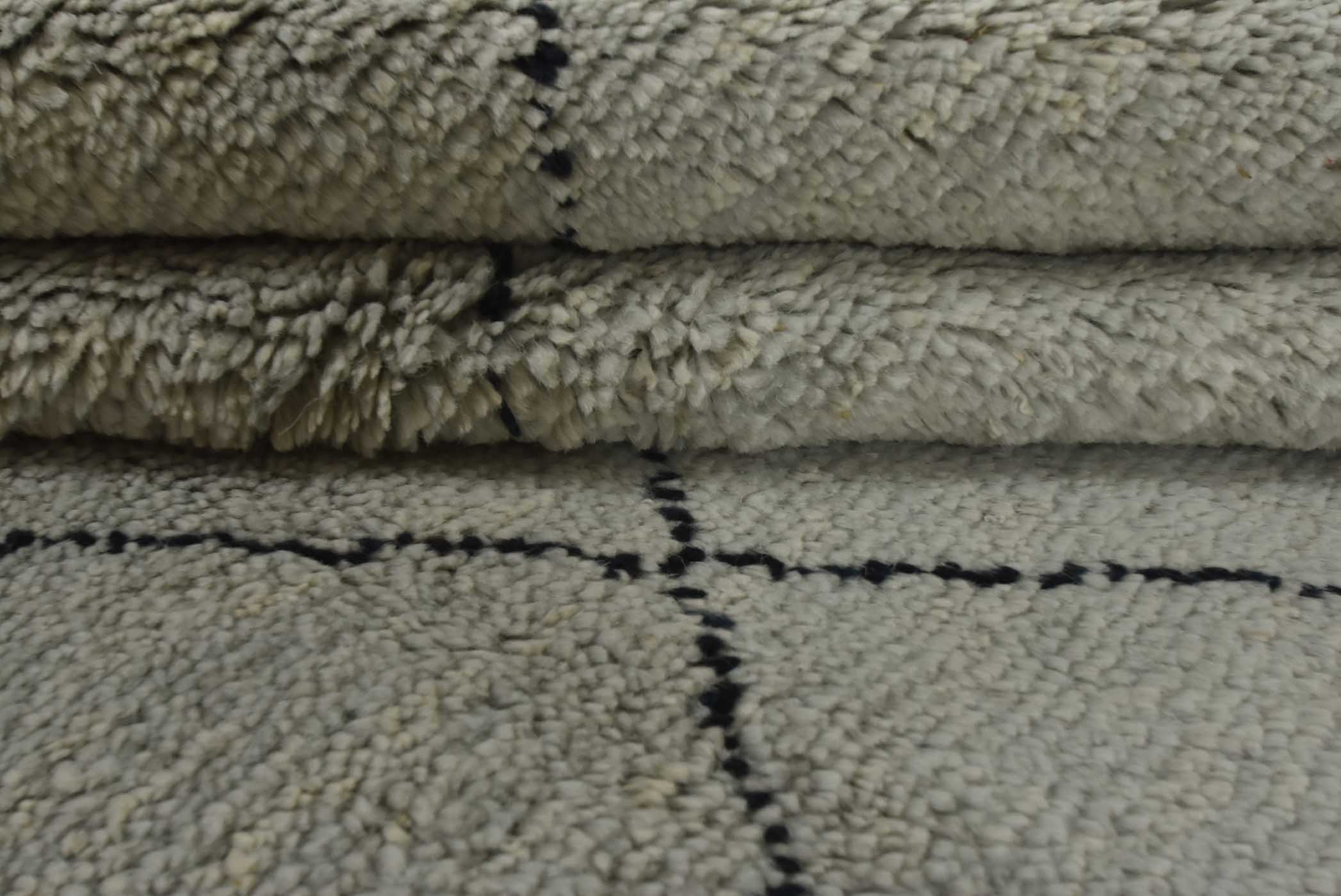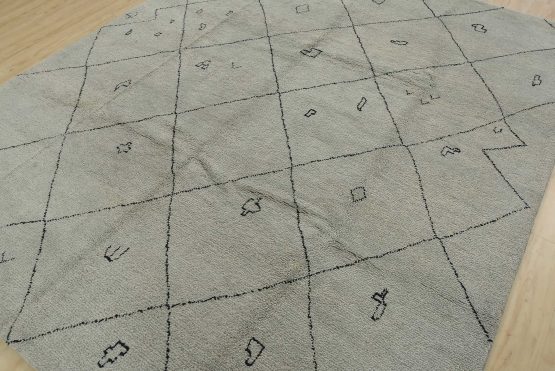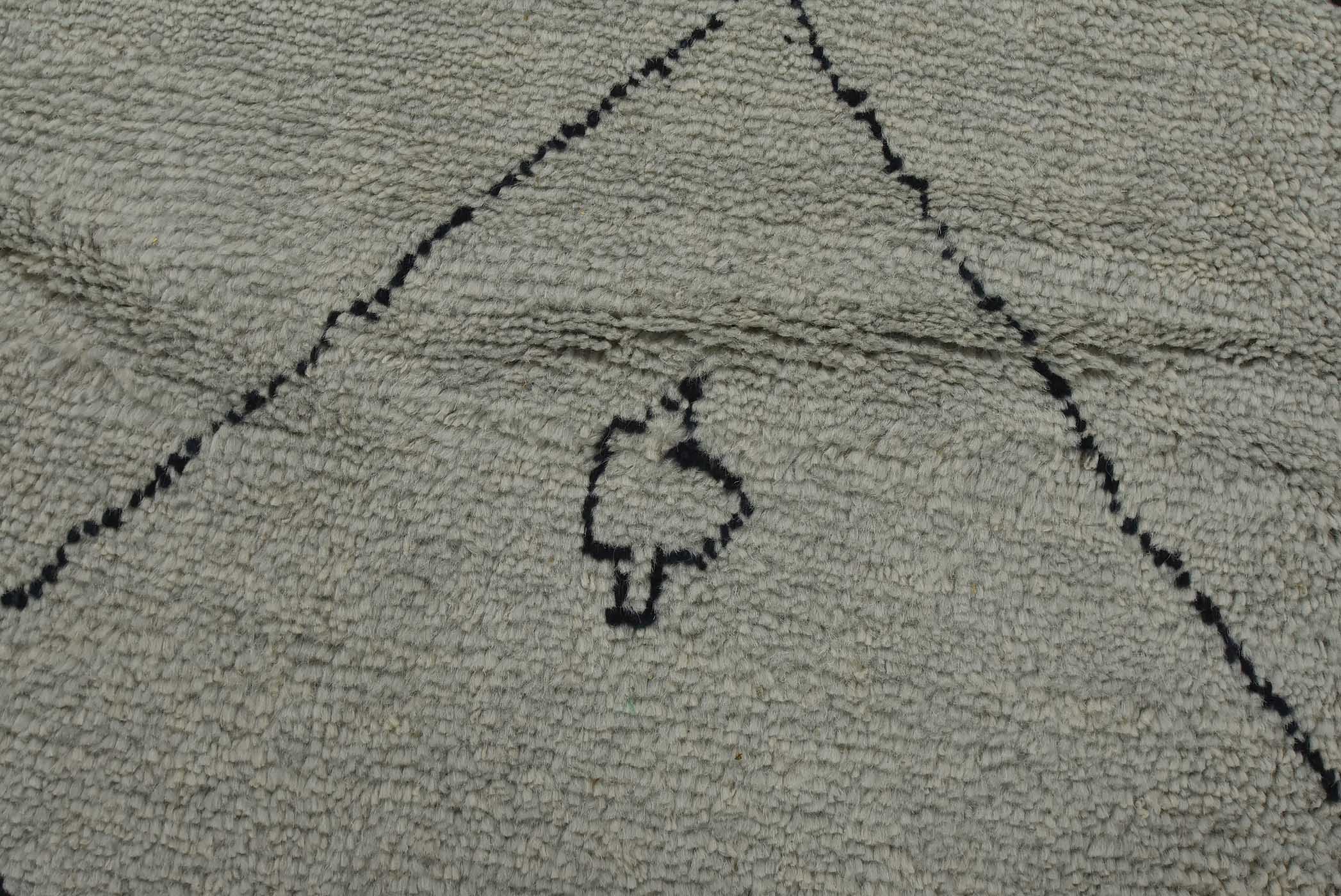 A contemporary Moroccan rug hand-knotted with an all-wool pile on a cotton foundation. This plush area rug features an all-over geometric pattern set against a gray background. It is new and in excellent condition.