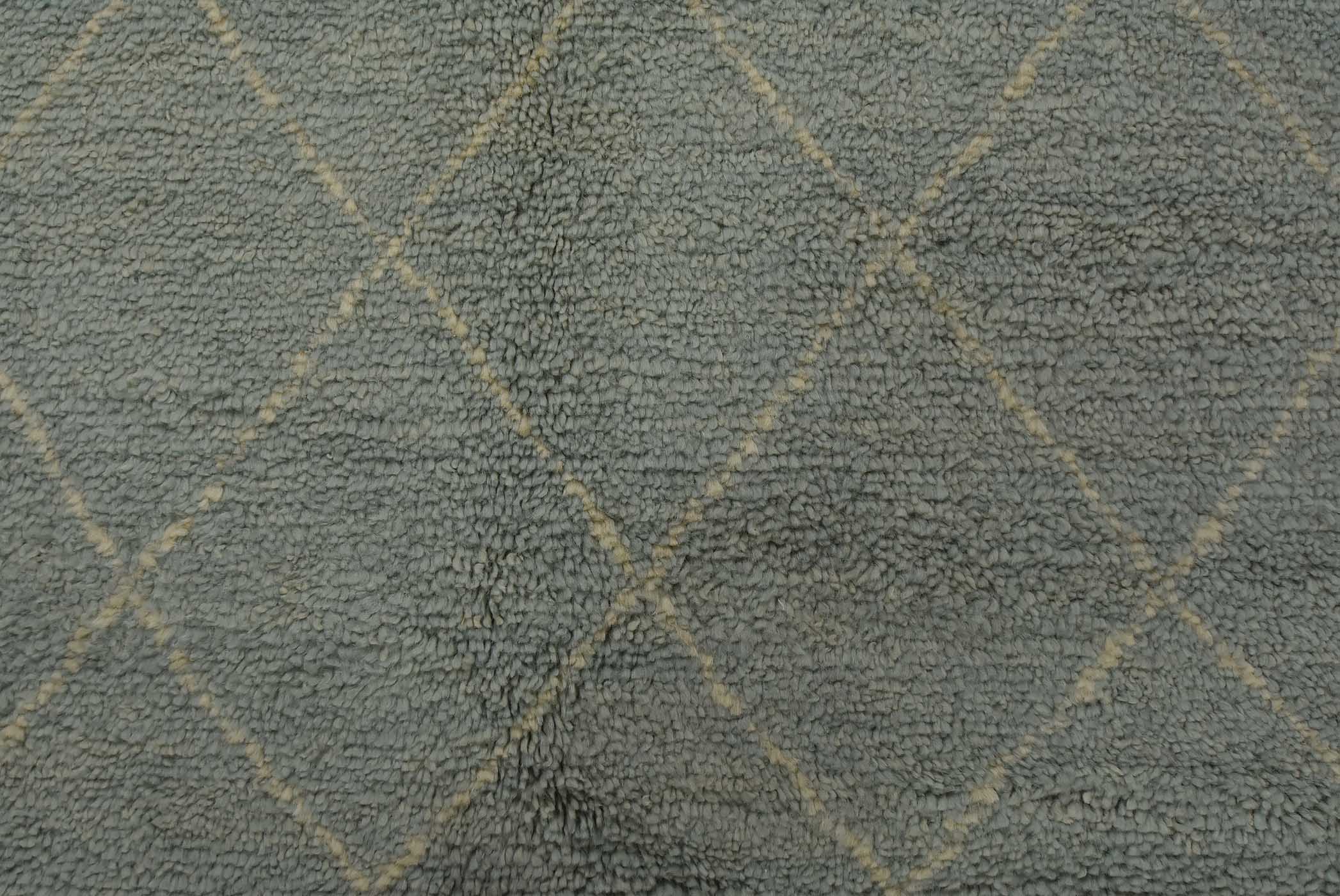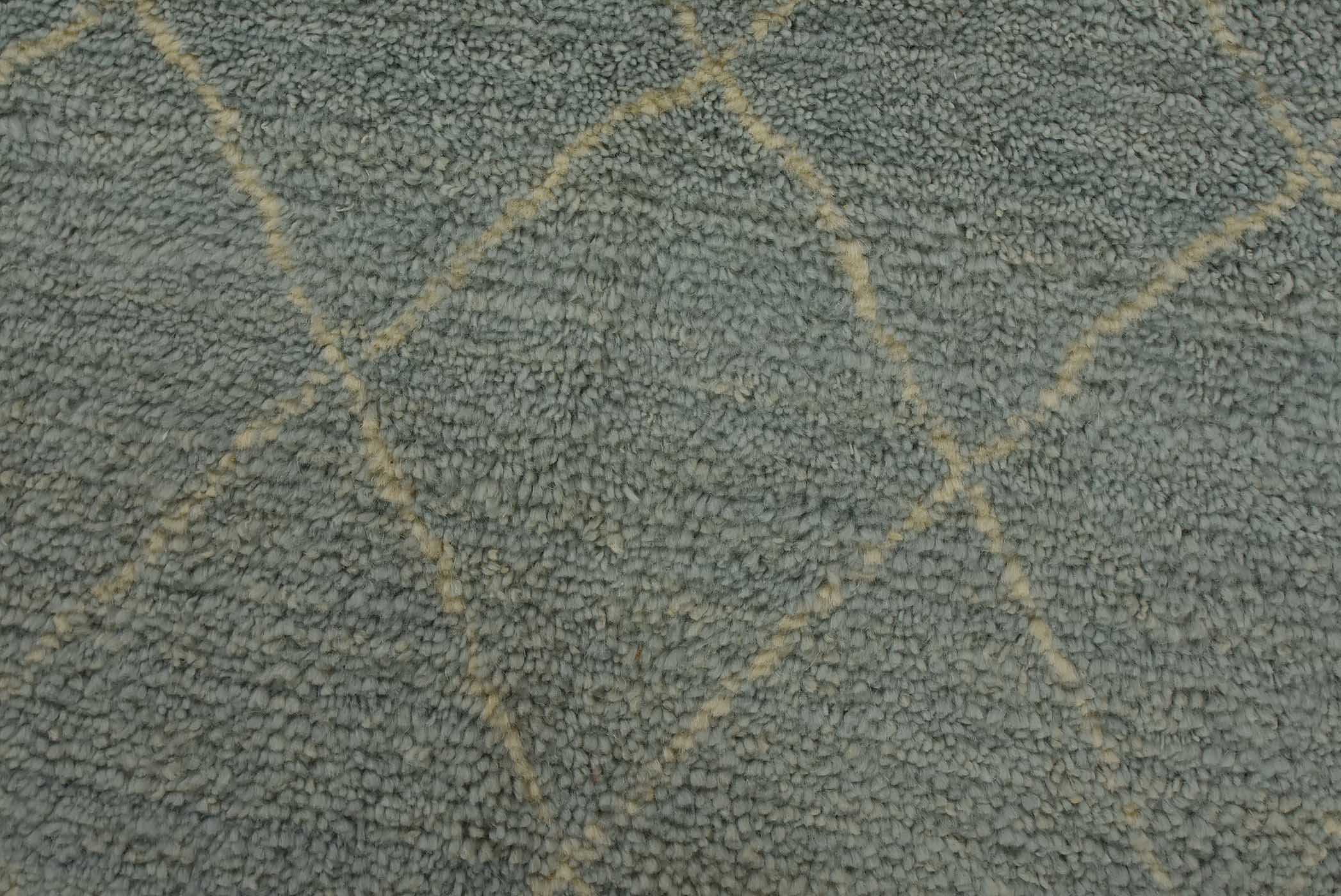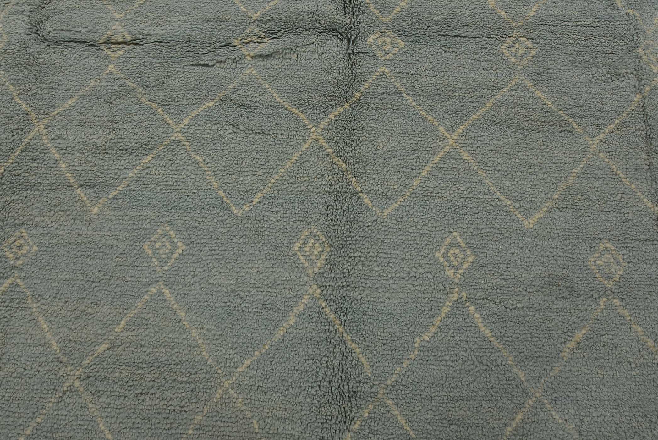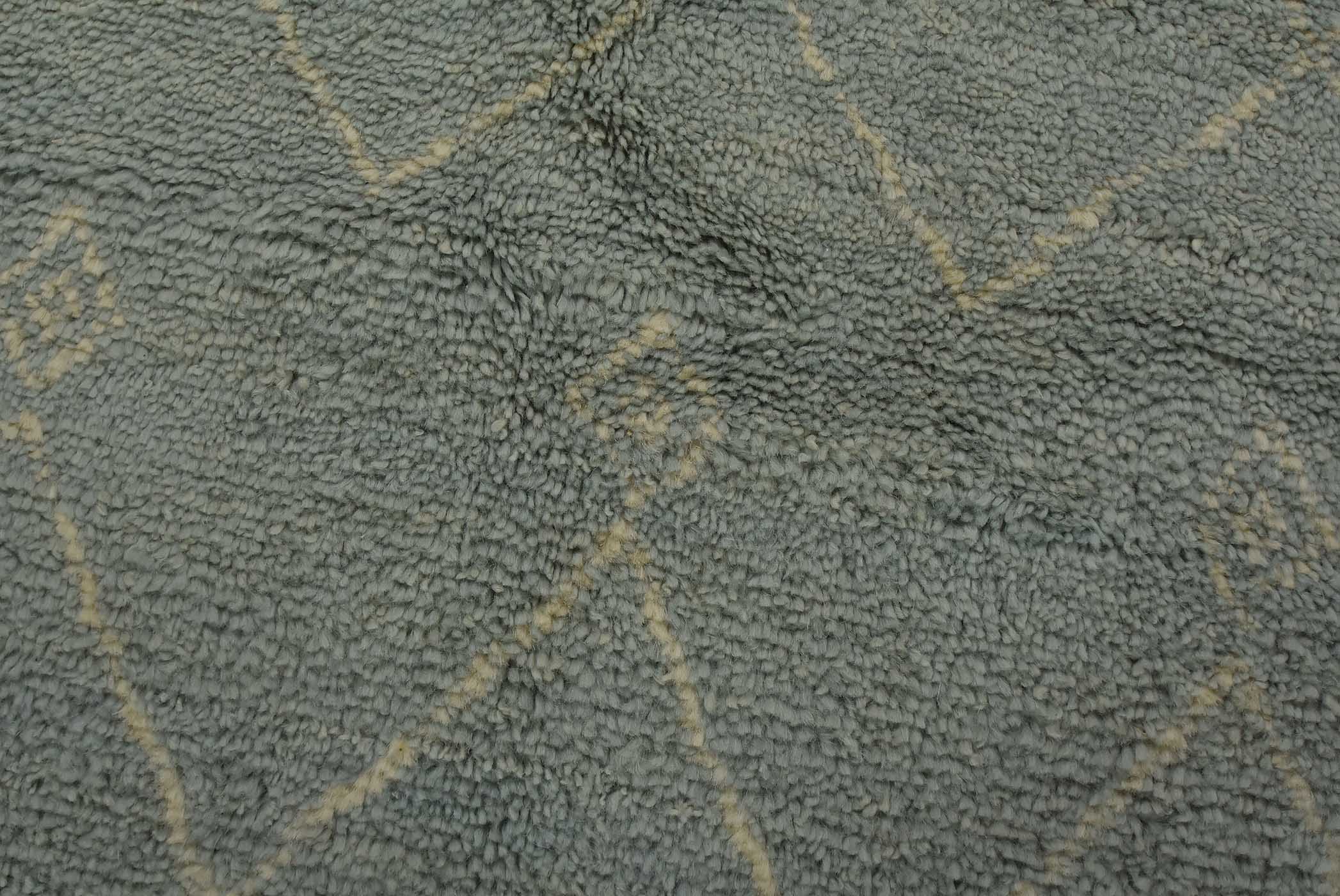A contemporary Moroccan rug hand-knotted with an all-wool pile on a cotton foundation. This plush area rug features a geometric pattern set against a blue background. It is new and in excellent condition.