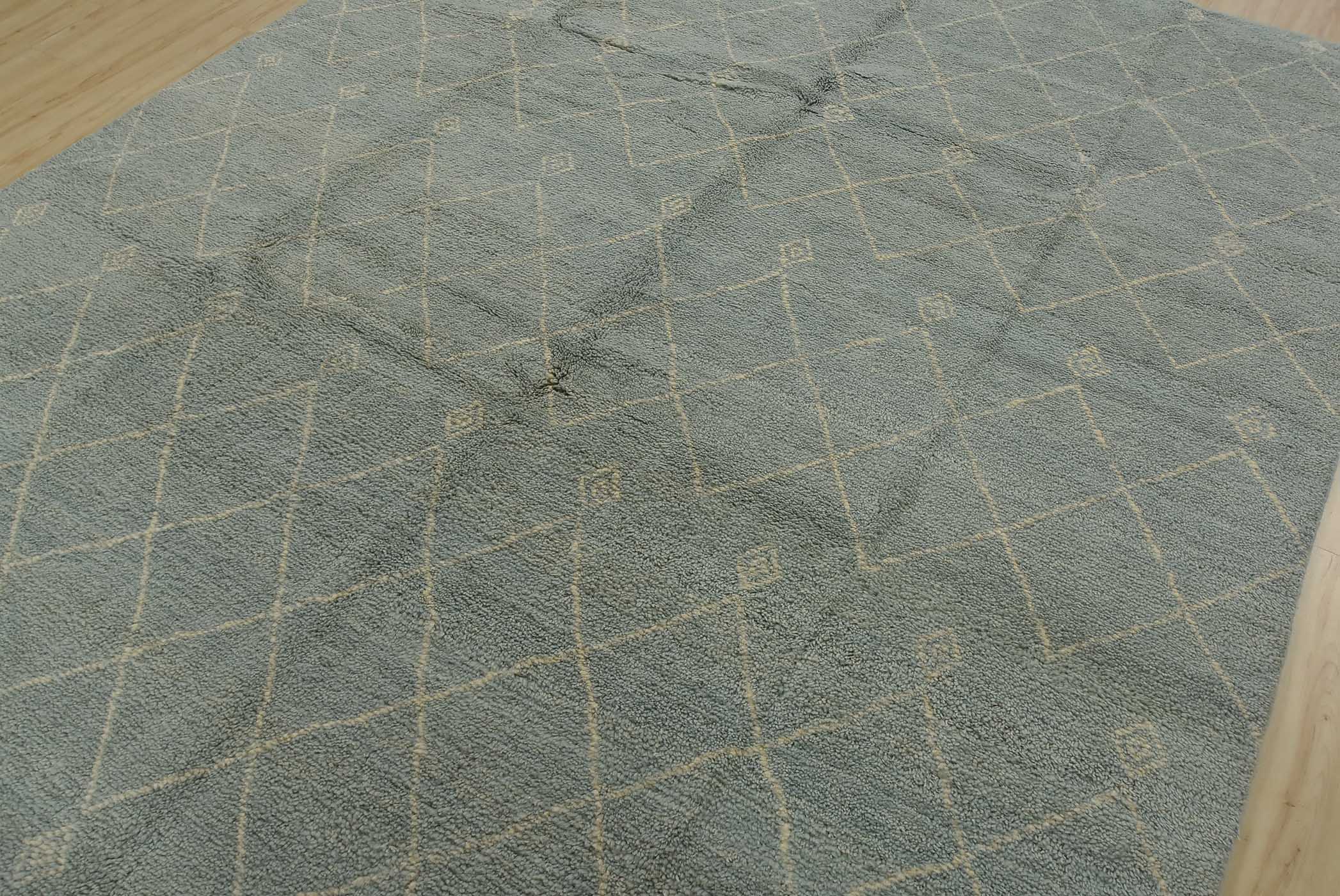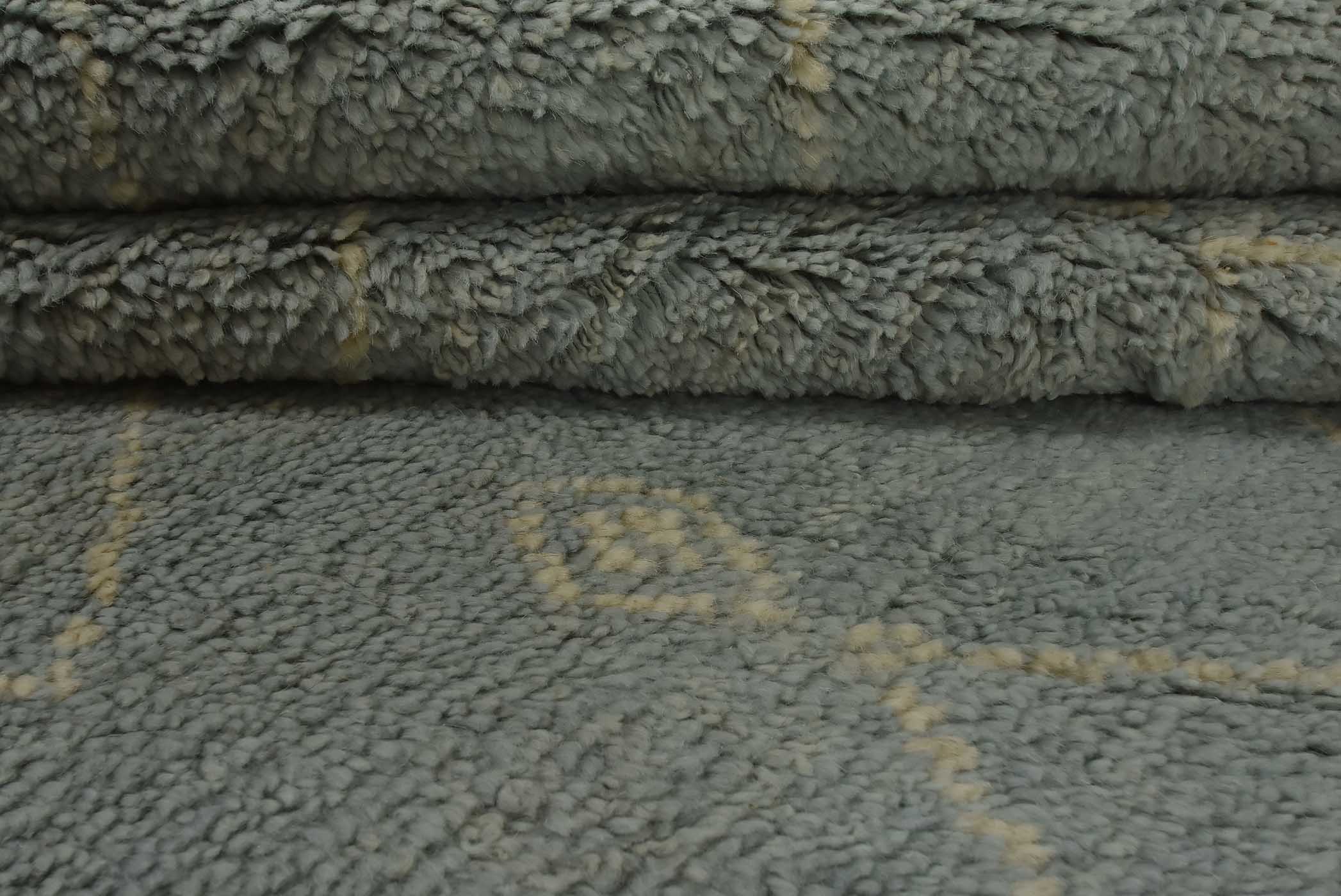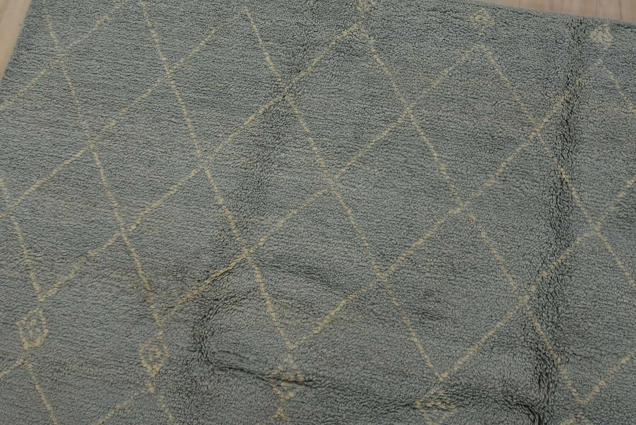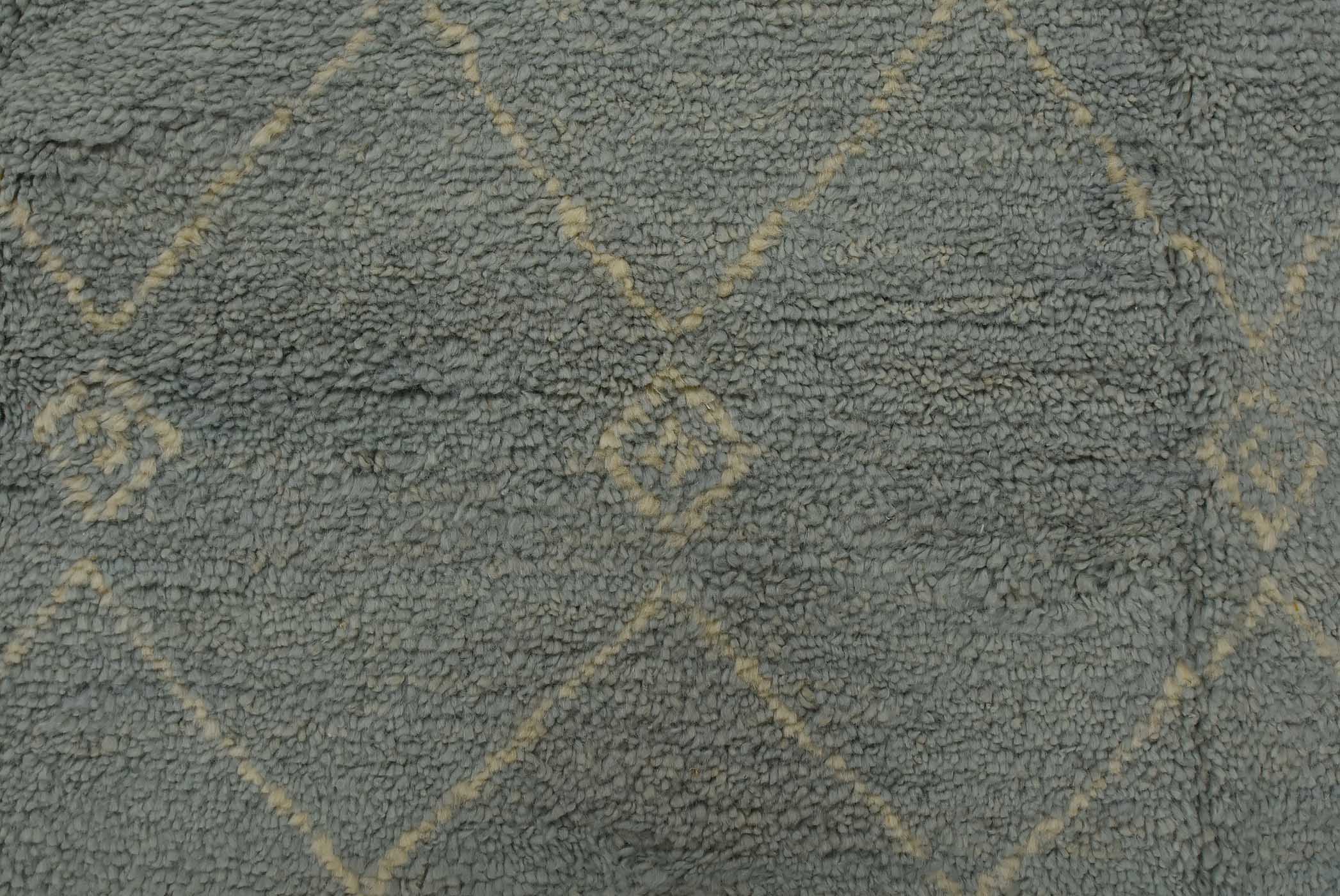 A contemporary Moroccan rug hand-knotted with an all-wool pile on a cotton foundation. This plush area rug features a geometric pattern set against a blue background. It is new and in excellent condition.