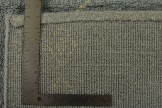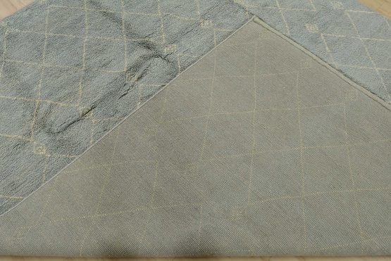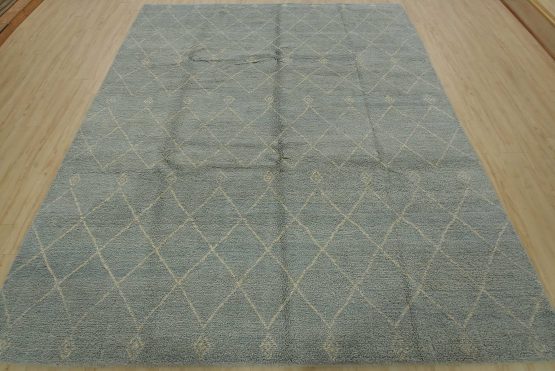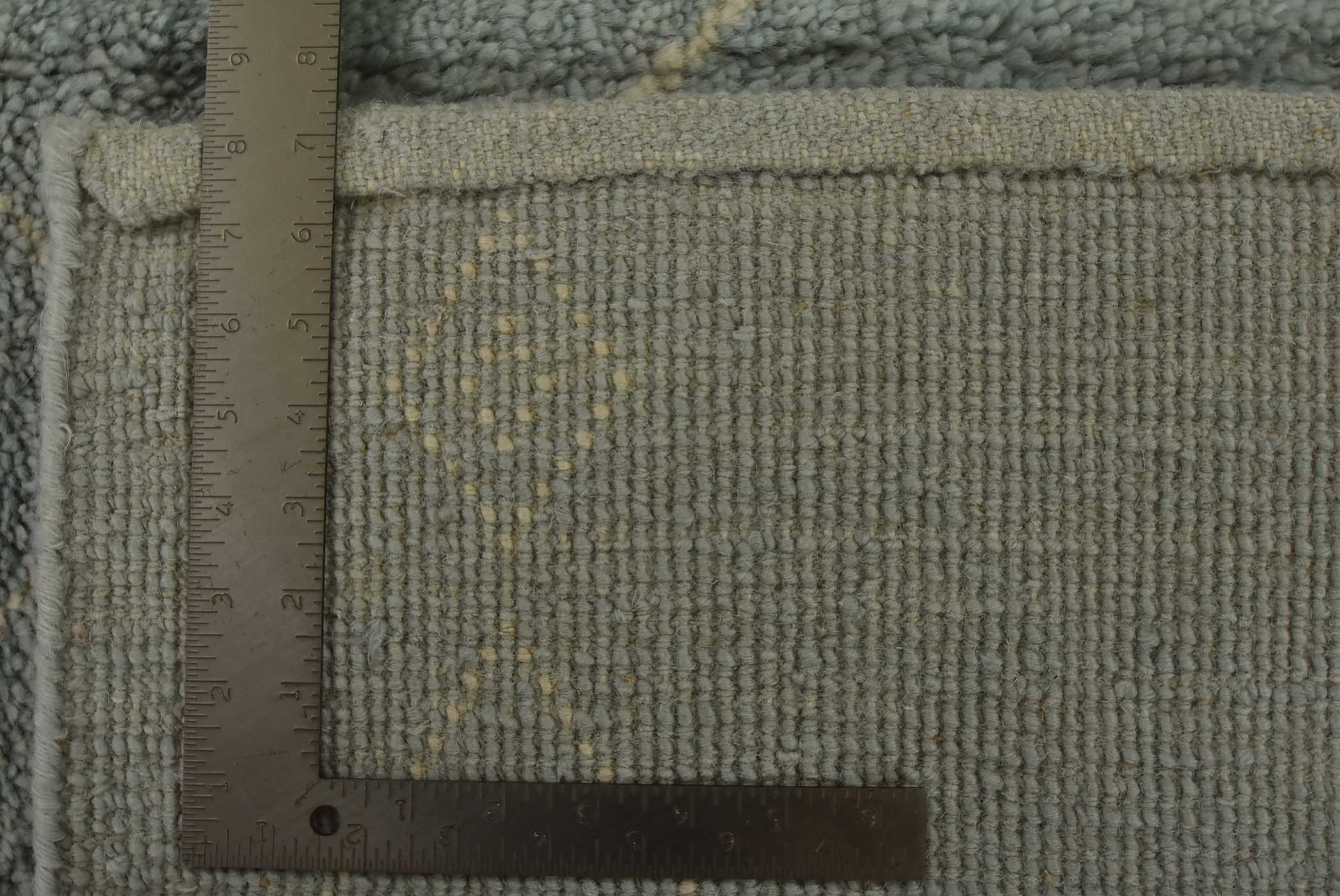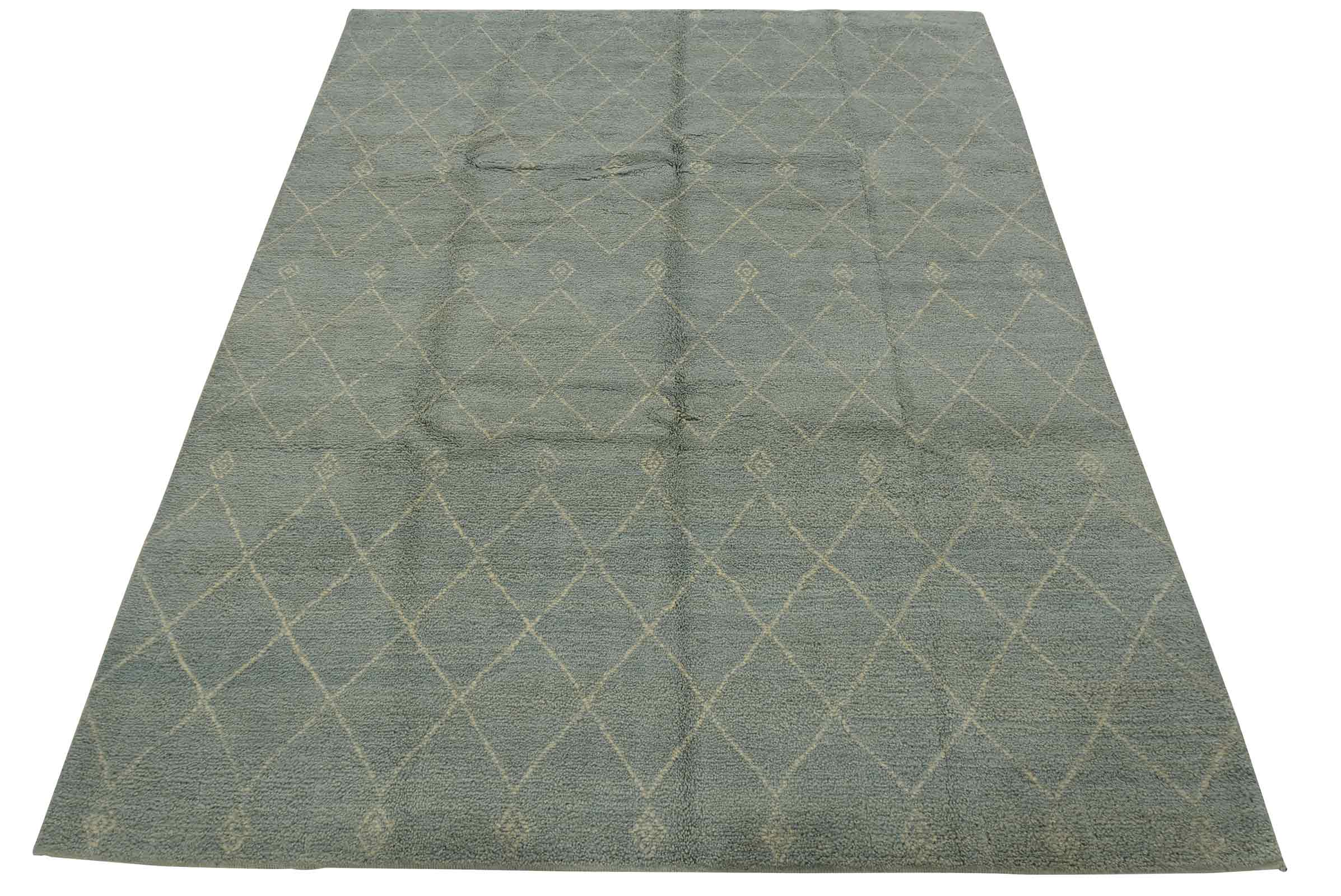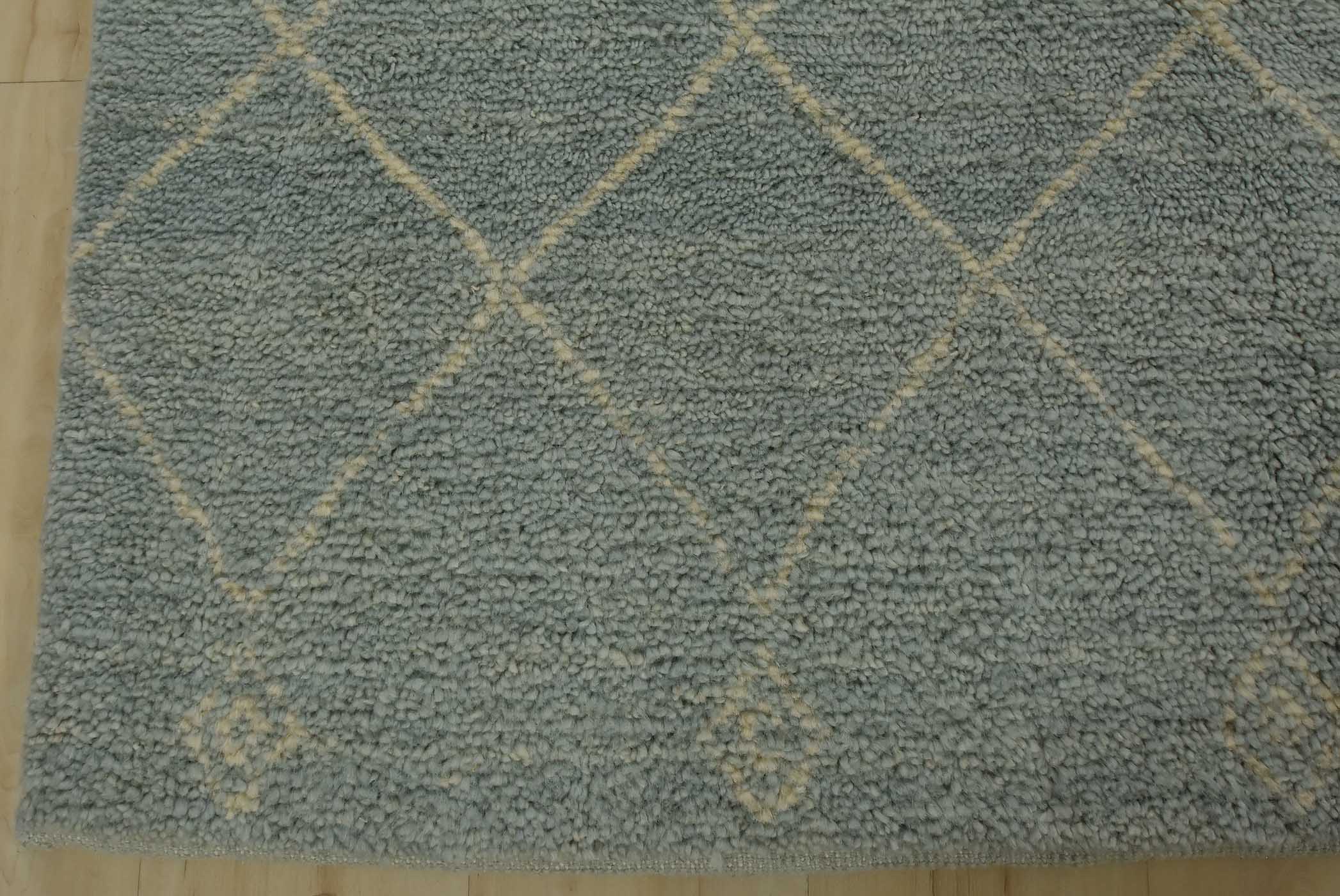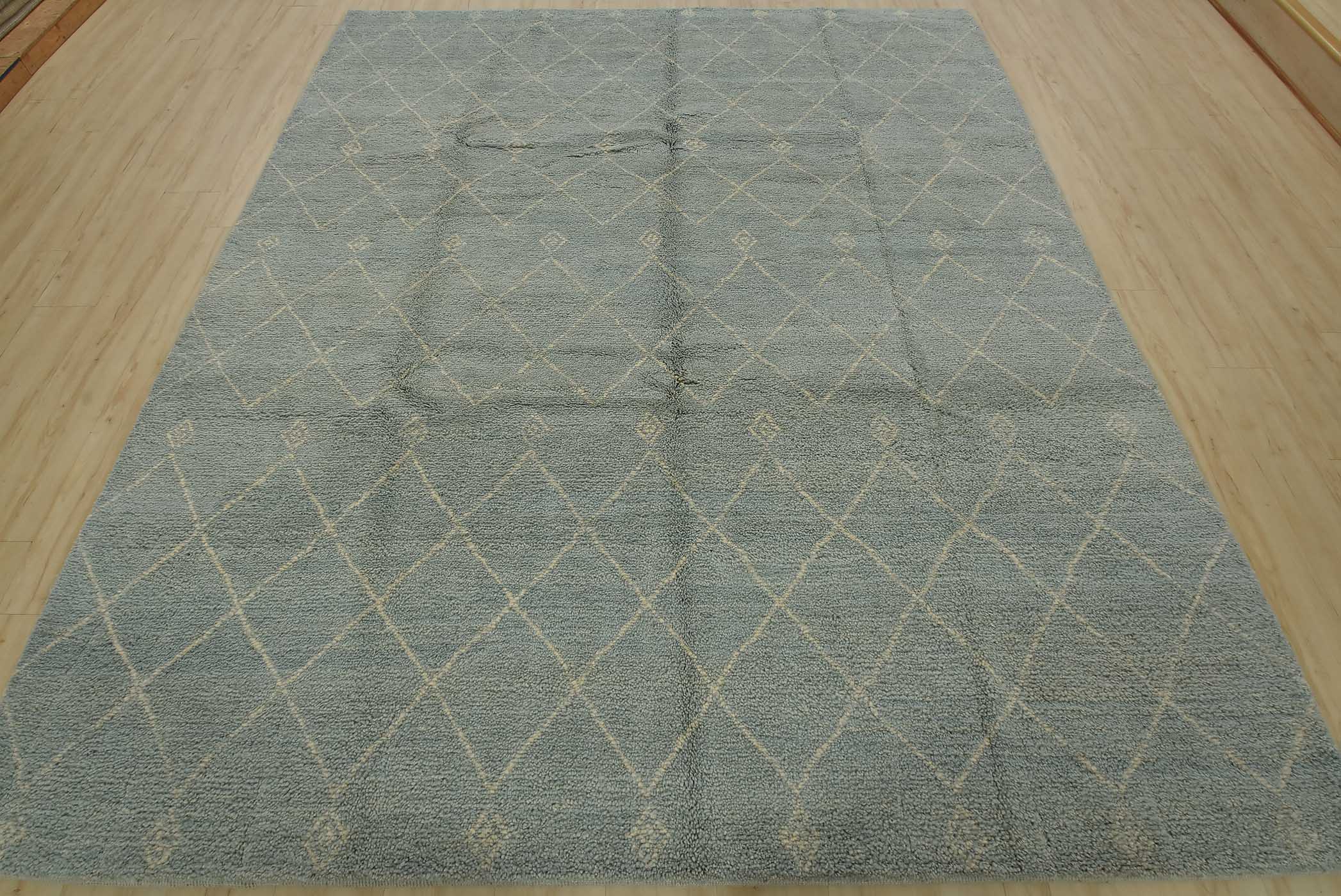 A contemporary Moroccan rug hand-knotted with an all-wool pile on a cotton foundation. This plush area rug features a geometric pattern set against a blue background. It is new and in excellent condition.
