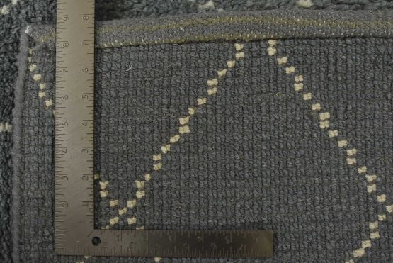 A contemporary Moroccan rug hand-knotted with an all-wool pile on a cotton foundation. This plush area rug features an all-over geometric pattern set against a blue background. It is new and in excellent condition.